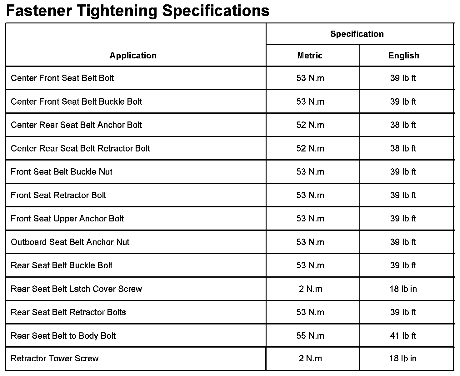 Fastener Tightening Specifications: