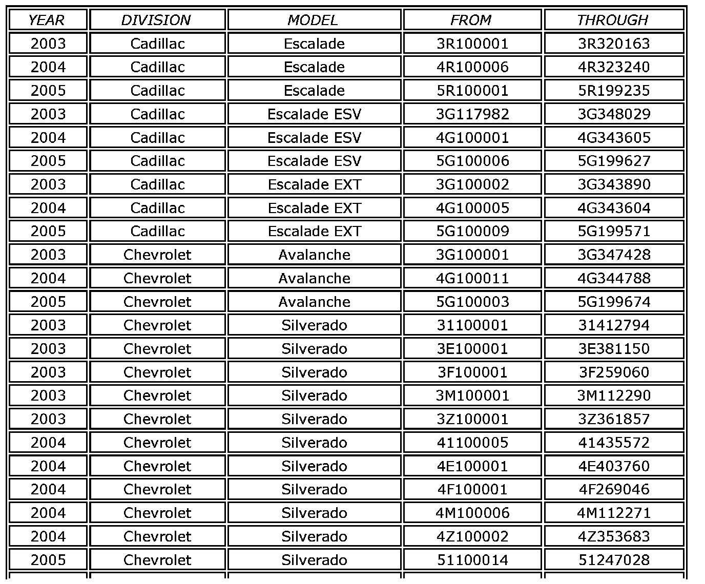 Involved are all 2003 and 2004 model year and certain U.S. 2005 Cadillac Escalade, Escalade ESV, and Escalade EXT; Chevrolet Avalanche, Silverado, Suburban, and Tahoe; and GMC Sierra, Yukon, and Yukon XL vehicles built within the VIN breakpoints shown above.