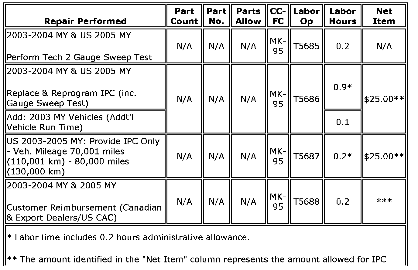 There are pre-programming instructions for 2003 model year instrument panel clusters (IPC). In order for the engine hours to set to their current value when the IPC is replaced, carefully read and follow the instructions below. This information is applicable for 2003 model year IPCs only. An add time of 0.1 for the pre-programming requirement is published in the Claim section of the bulletin.