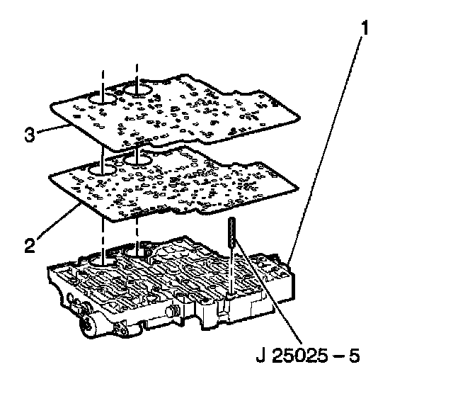 3. Install the valve body spacer plate (3) onto the valve body gasket (2).
