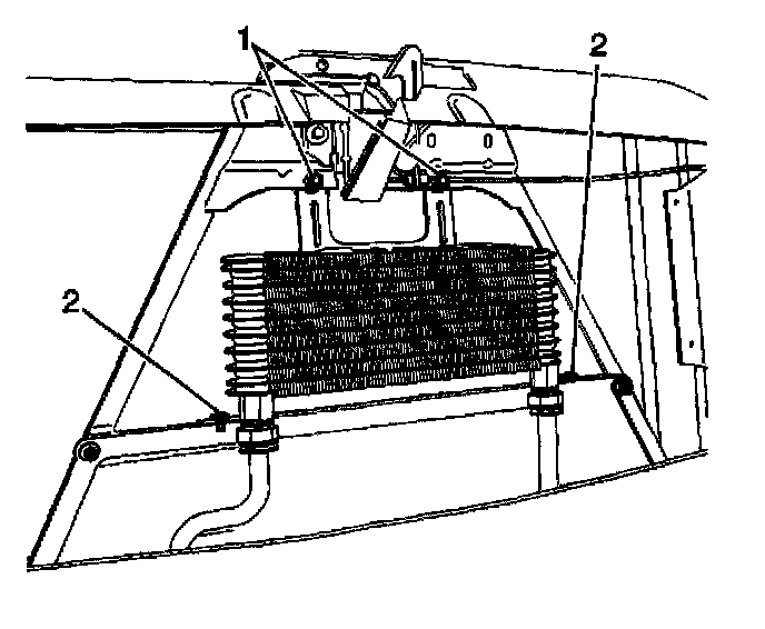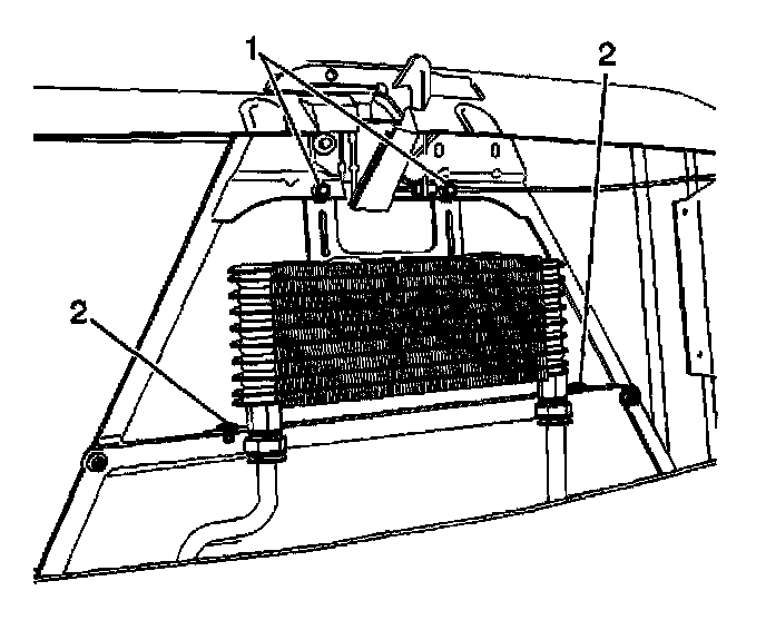 2. Install the bolts (1) and the push pins (2) that retain the auxiliary oil cooler to the radiator brace.