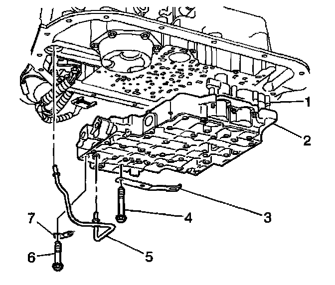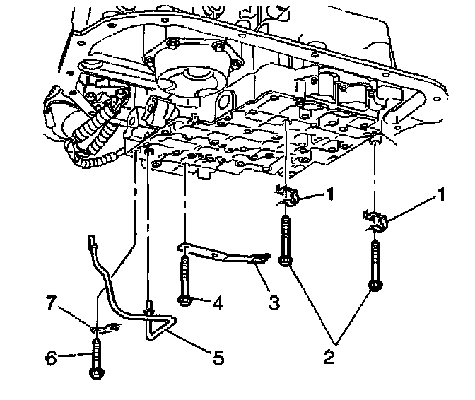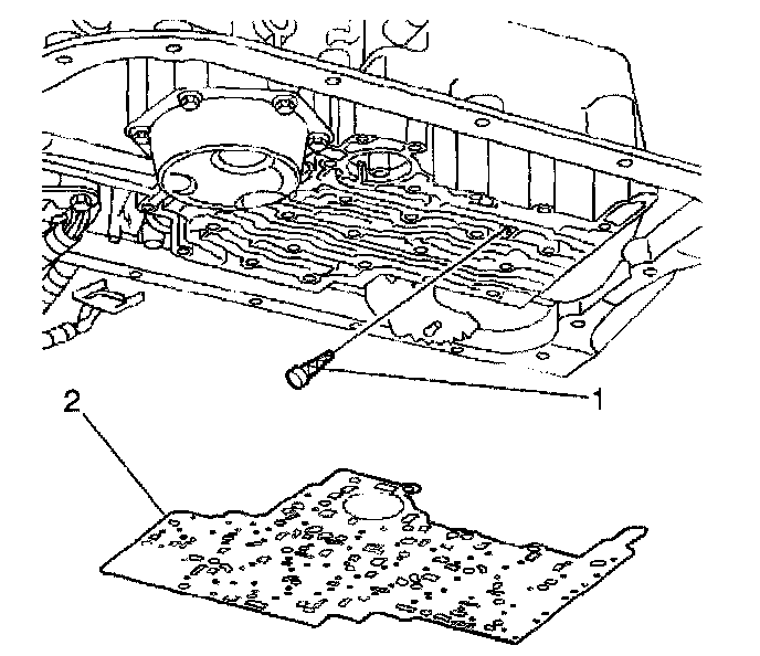 5. Remove the valve body bolts (1) that retain the (TFP) manual valve position switch (2).