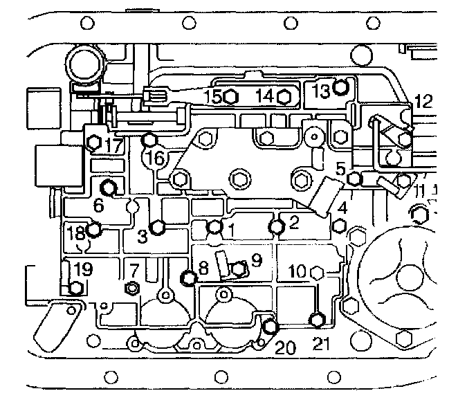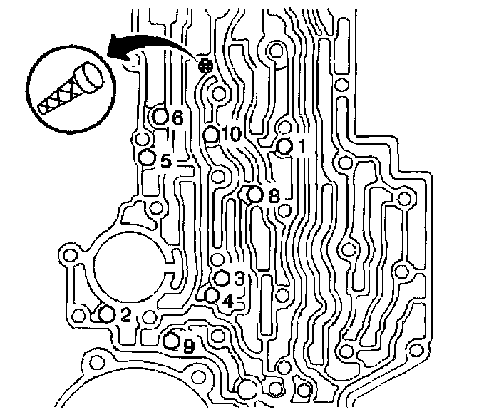 11. Install the valve body (5). Attach the manual valve to the detent lever while installing the valve body.