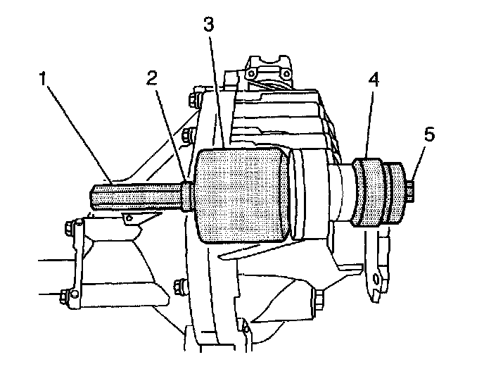 2.1. Install the J21474-18 (1), the thrust bearing (2), the J36616-2 (3), the J36616-1 (4), and the forcing screw (5) as shown.