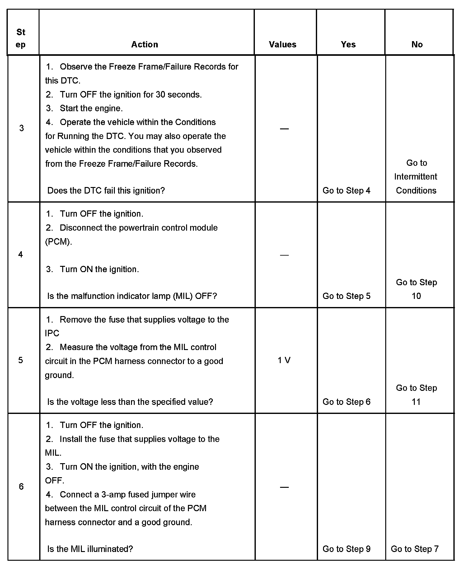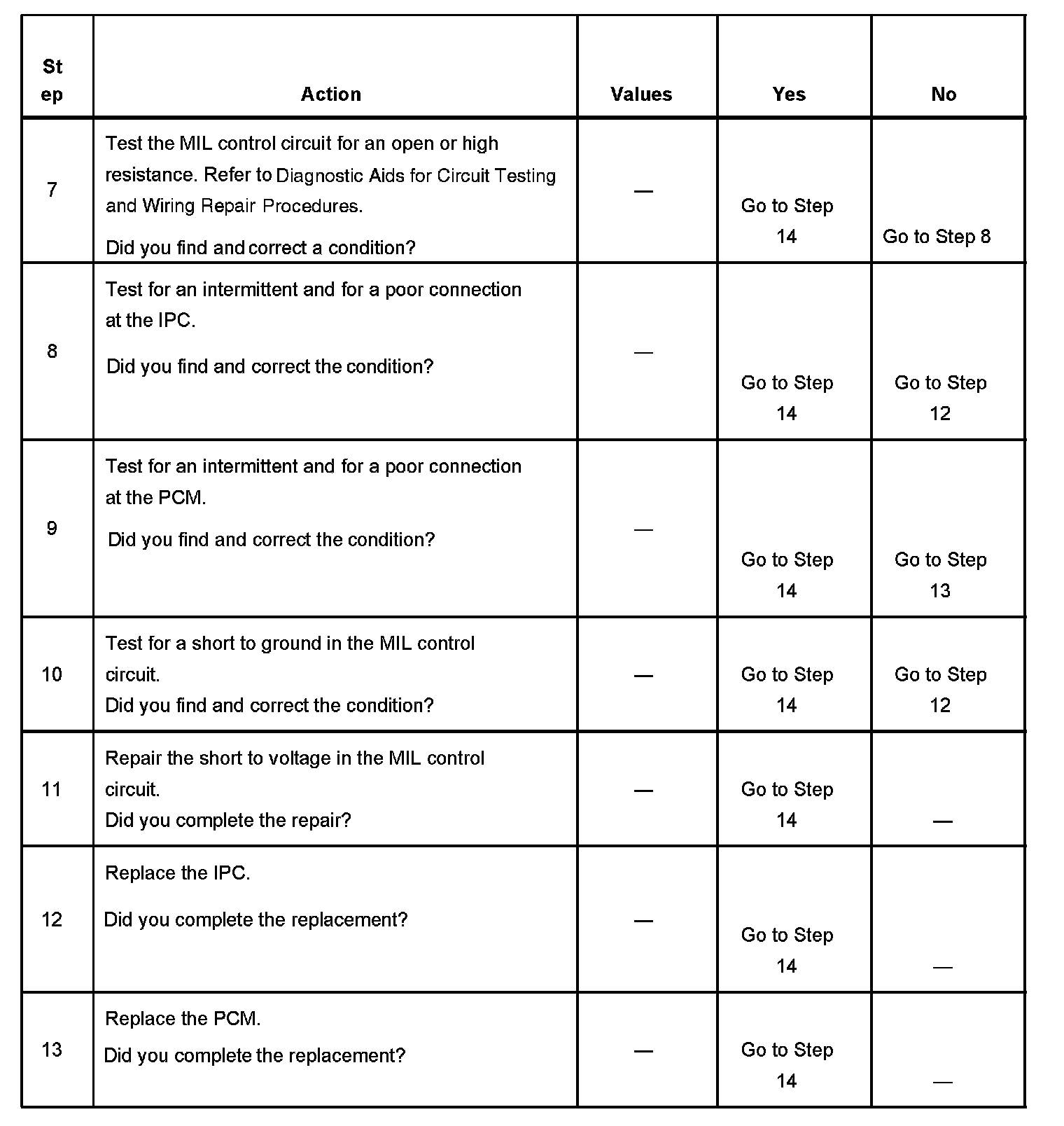 4. This step tests for a short to ground in the MIL control circuit. With the powertrain control module (PCM) disconnected and the ignition ON, the MIL should be OFF.