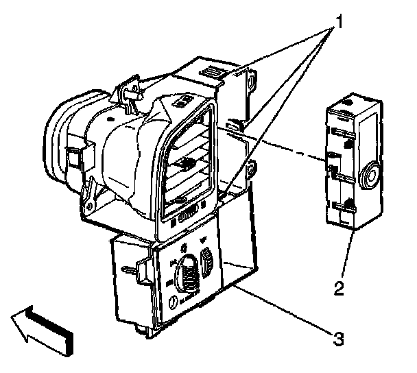 2. Install the traction control switch (2) into the instrument panel (IP) assembly (3), making sure that all of the switch retaining tabs (1) are engaged.