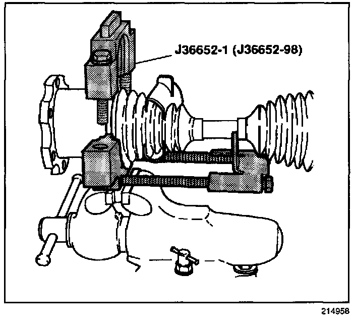 13. Position the inboard end (tripot end) of the halfshaft assembly into the base of the J-36652-01 for the 1500 models (except 1500HD) or J 36652-98 for the 1500HD, 2500, 3500 and HUMMER H2 models.