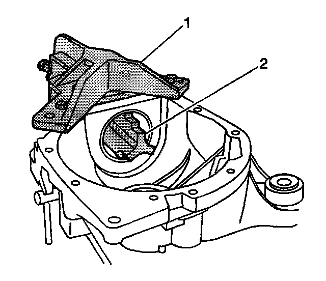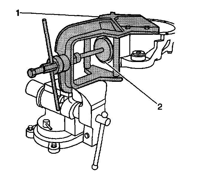 11. Extend the forcing screw of the J36598 (1) through the J36598-15 and thread it into the J36598-3 or the J36598-4 (2) until fully seated.