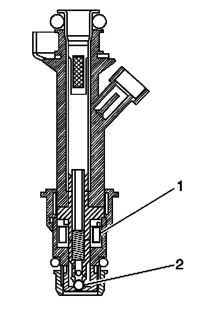 The Multec 2 fuel injector assembly is a solenoid device, controlled by the PCM, that meters pressurized fuel to a single engine cylinder. The PCM energizes the high-impedance (12.0 ohms) injector solenoid (2) to open a normally closed ball valve (3). This allows fuel to flow into the top of the injector, past the ball valve, and through a director plate at the injector outlet. The director plate has two machined holes that control the fuel flow, generating a spray of finely atomized fuel at the injector tip. Fuel from the injector tip is directed at the intake valve, causing it to become further atomized and vaporized before entering the combustion chamber. This fine atomization improves fuel economy and emissions.
