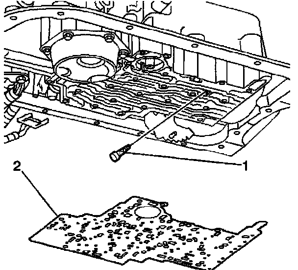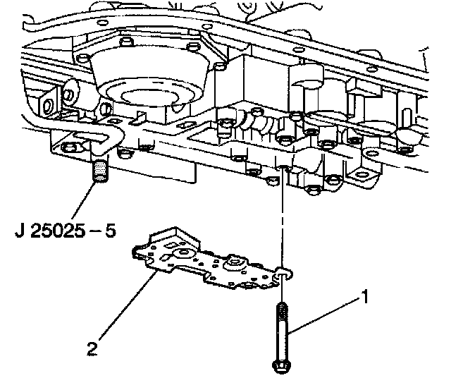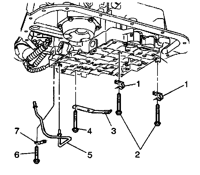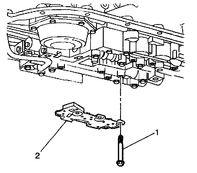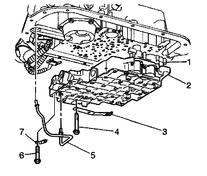 5. Remove the valve body bolts (1) that retain the (TFP) manual valve position switch (2).