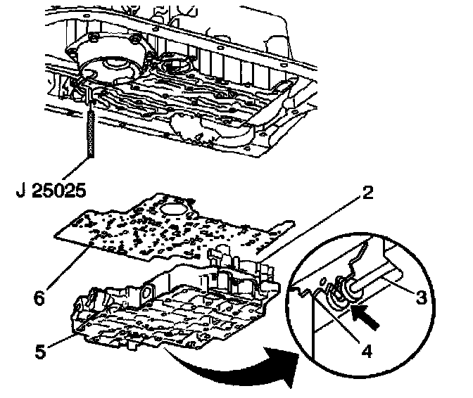 11. Install the valve body (5). Attach the manual valve to the detent lever while installing the valve body.