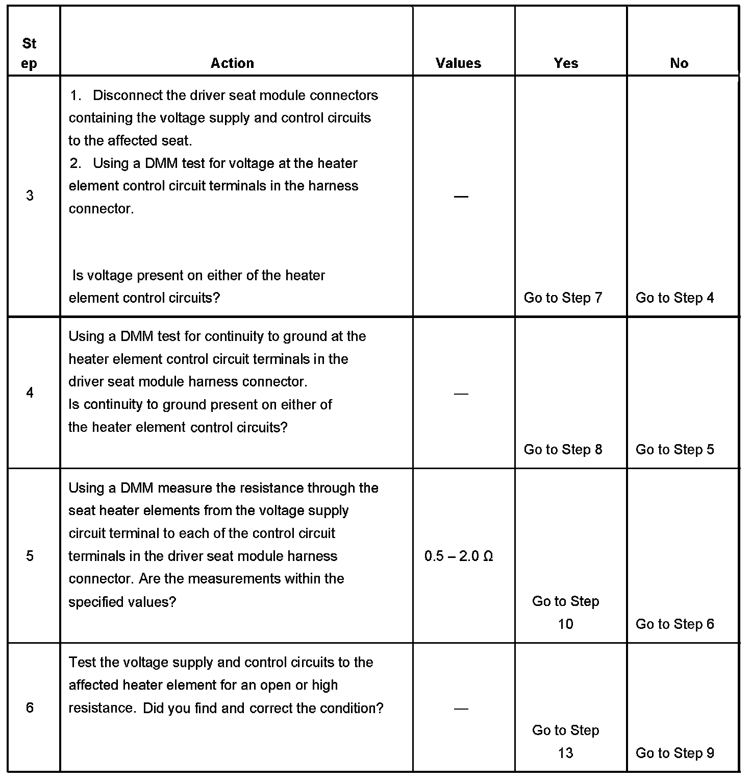 The driver seat module determines by monitoring the heater element control circuits that a short to voltage, short to ground, or open condition exists.