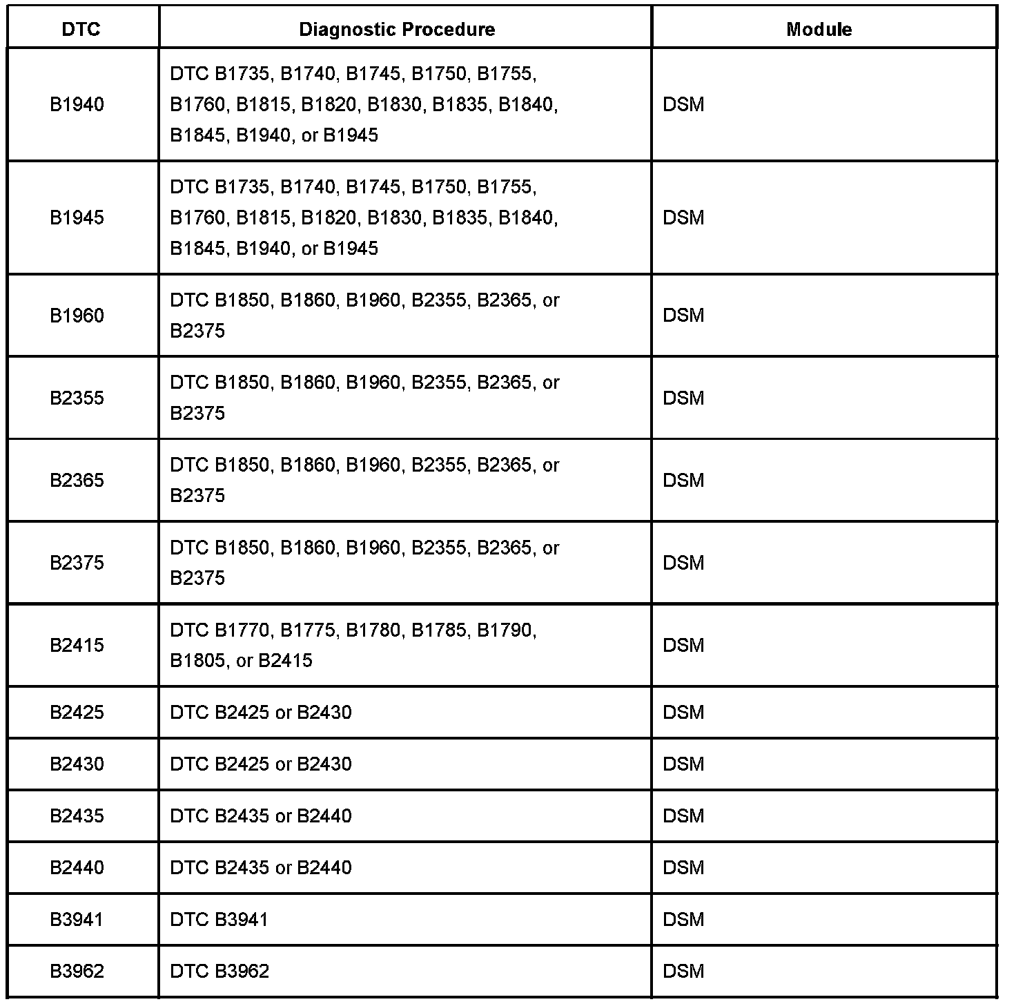 DTC B1940 - B3962: