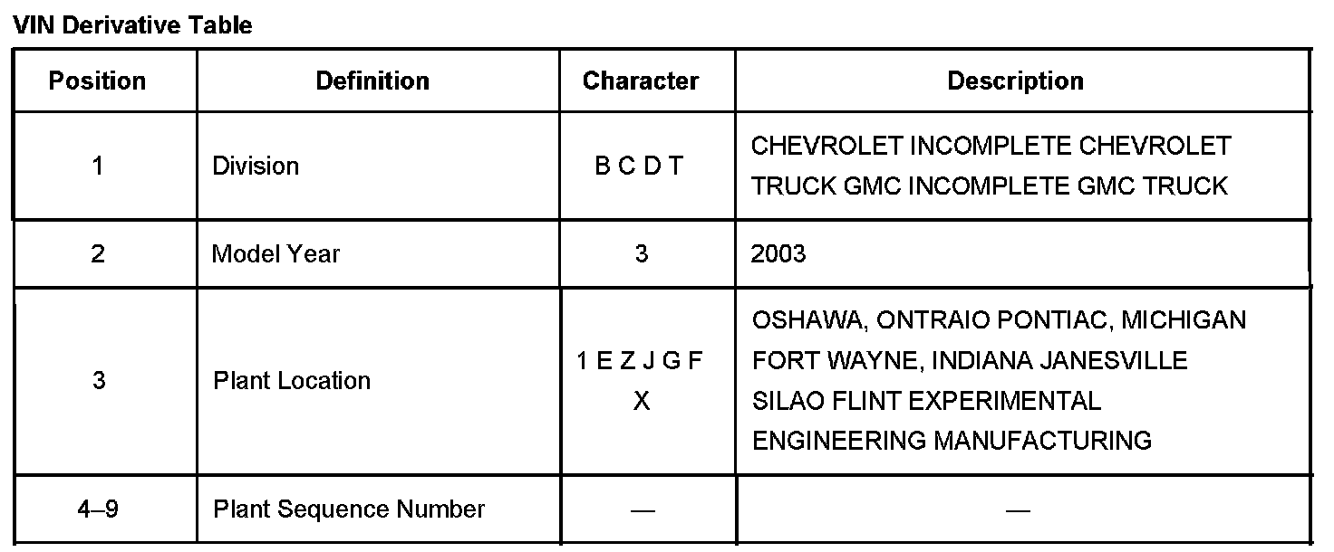 VIN Derivative Table: