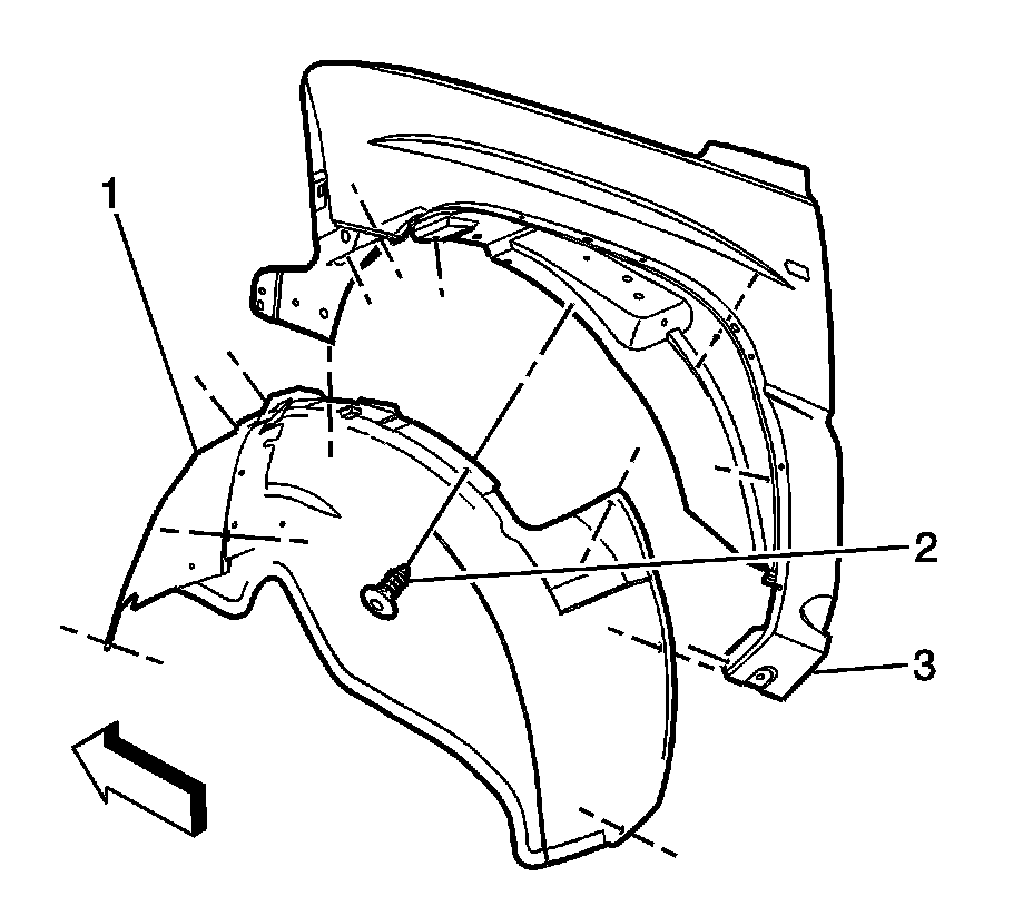 11. Remove the push-in retainers (2) in order to detach the wheelhouse panel (1) from the fender (3).