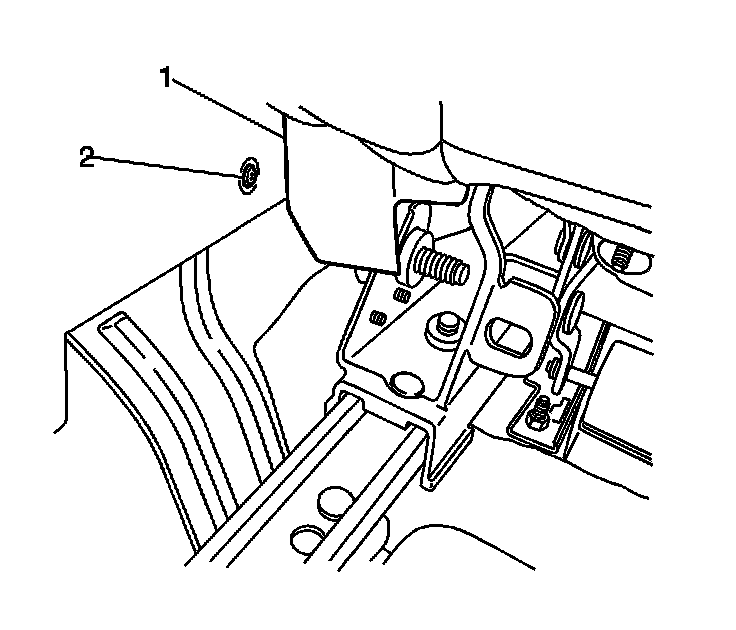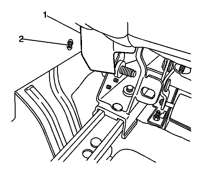 9. Reposition the inboard seat track trim (1) in order to gain access to the rear console side panel screw (2).