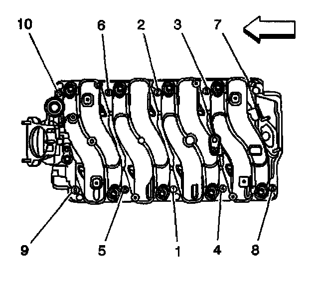 11. Tighten the intake manifold bolts in the sequence shown, using four passes.