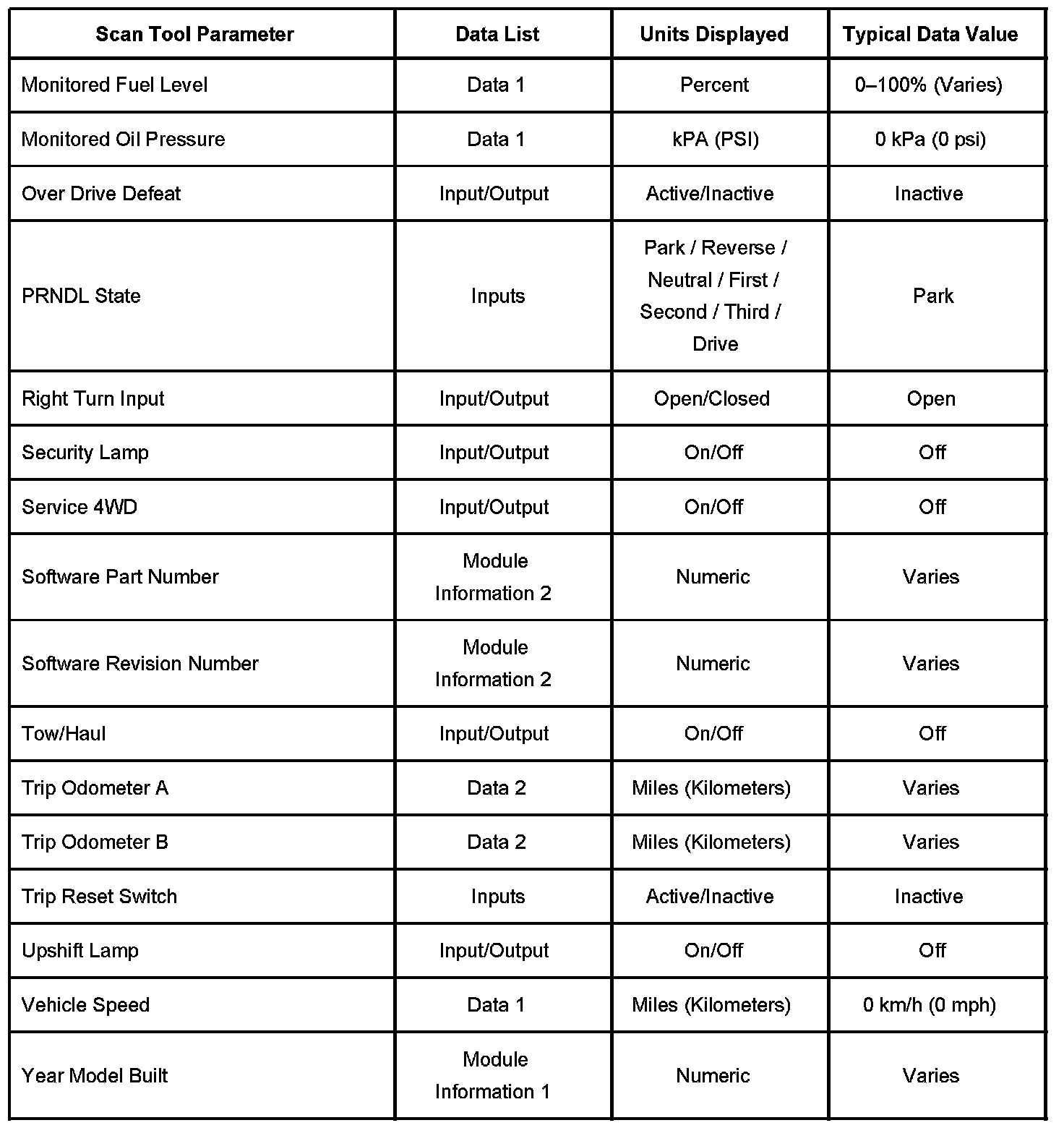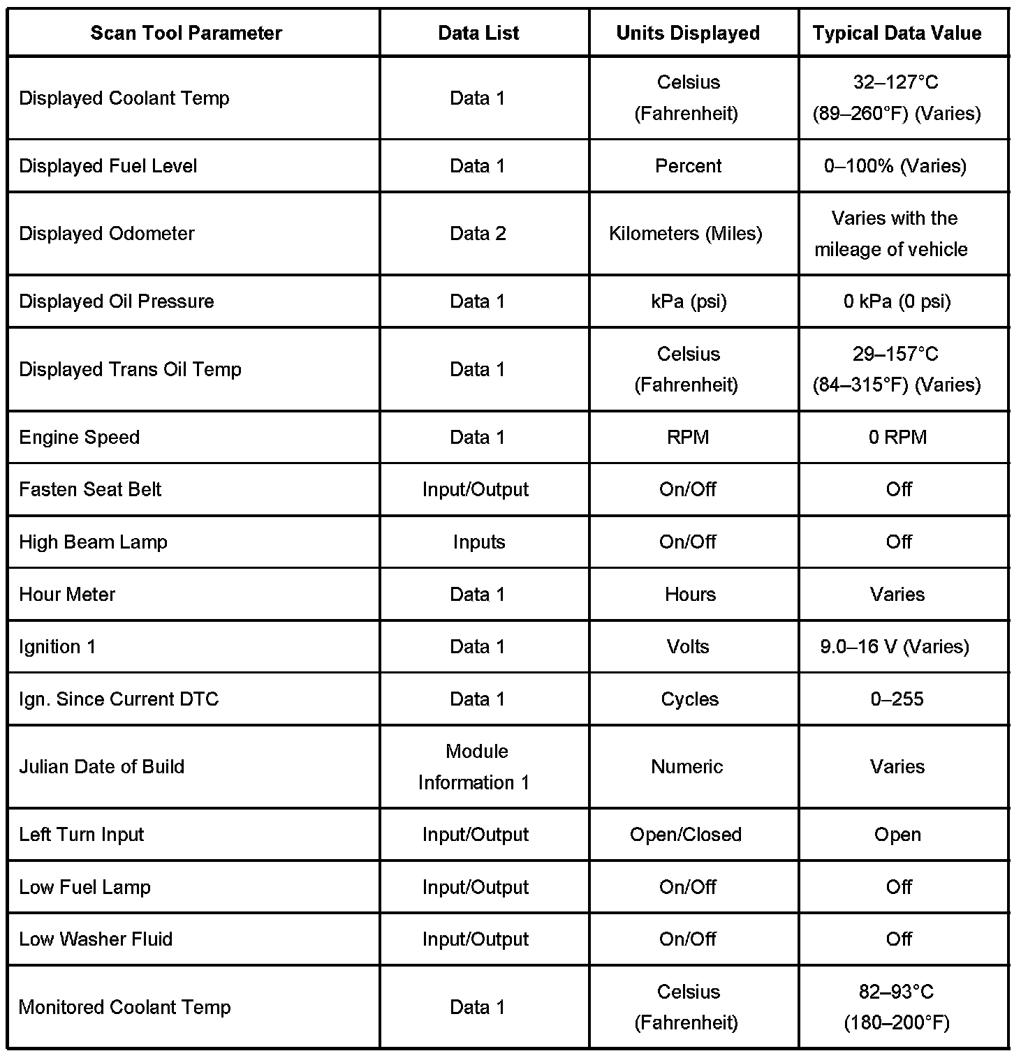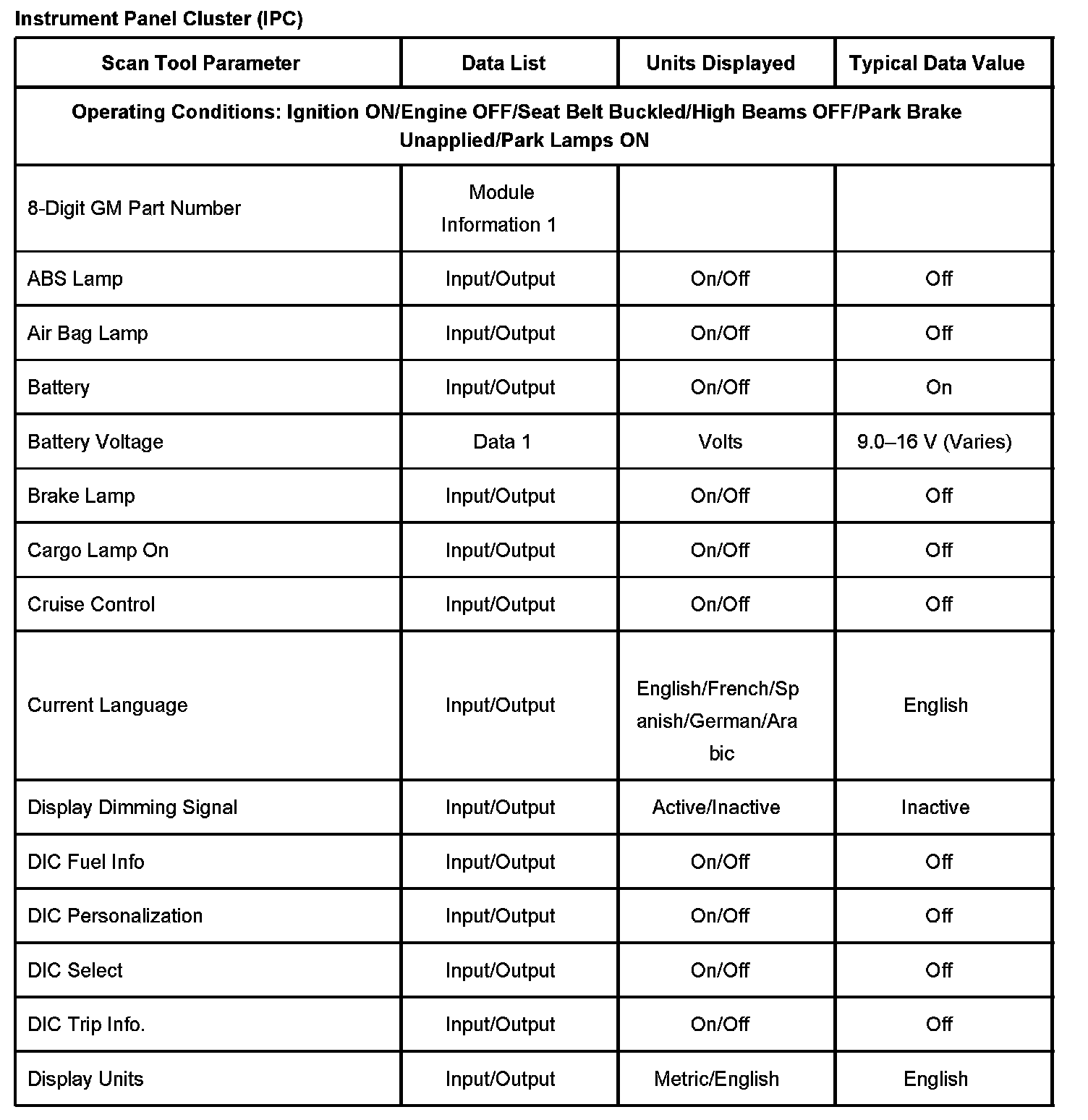 Scan Tool Data List - Instrument Panel Cluster (IPC)