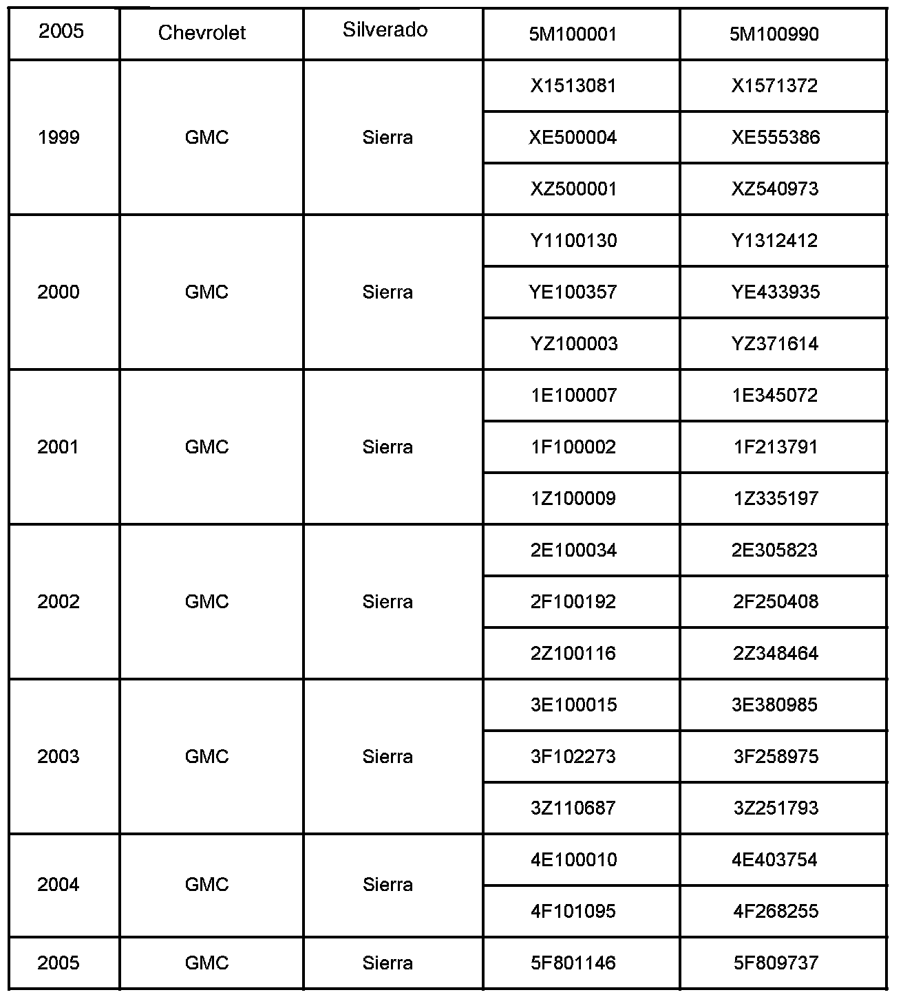 Involved are certain 1999-2002 Chevrolet Silverado and GMC Sierra 1500 Series, and 2001-2005 Chevrolet Silverado and GMC Sierra 2500/3500 Series vehicles equipped with a manual transmission and built within the VIN breakpoints shown.