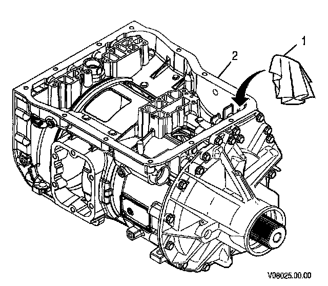 Important: Install a lint-free cloth into the park pawl apply assembly guide hole to prevent the selector valve pin from falling into the transmission. Install a lint-free cloth (1) in the park pawl apply assembly guide hole in main housing (2).