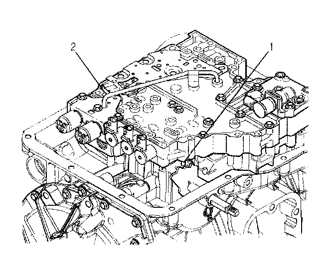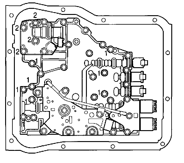 10. Install 11 control valve assembly bolts (1) and four bolts (2) into the G solenoid valve body.
