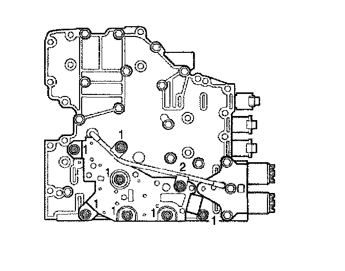 24. Install 3 bolts (1) retaining the A/B solenoid bracket (2).