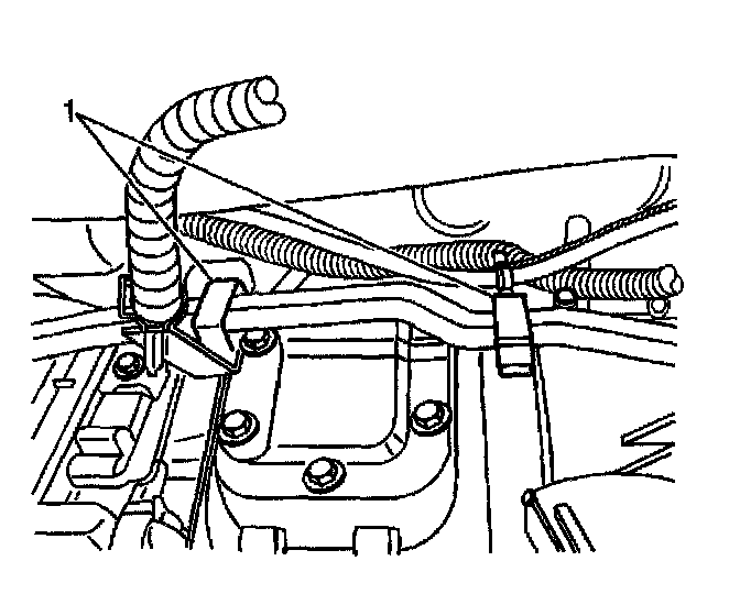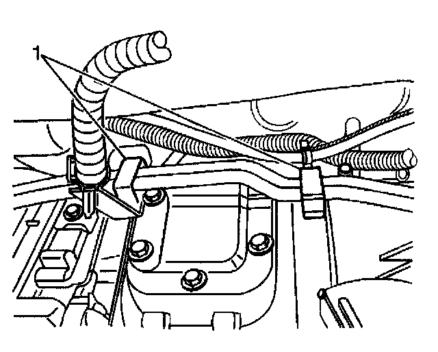 16. Remove the bolts from the fuel line retainers (1) on the left side of the transmission.