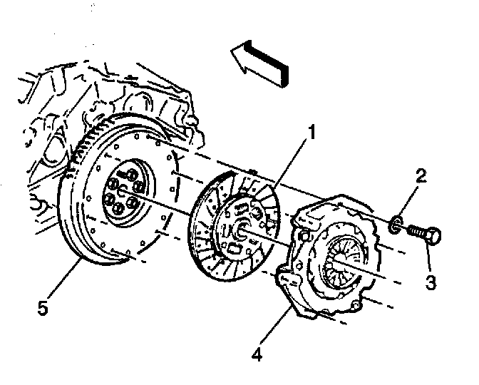 3. If equipped with a 4.3L engine, remove the clutch pressure plate bolts (3), and washers (2).