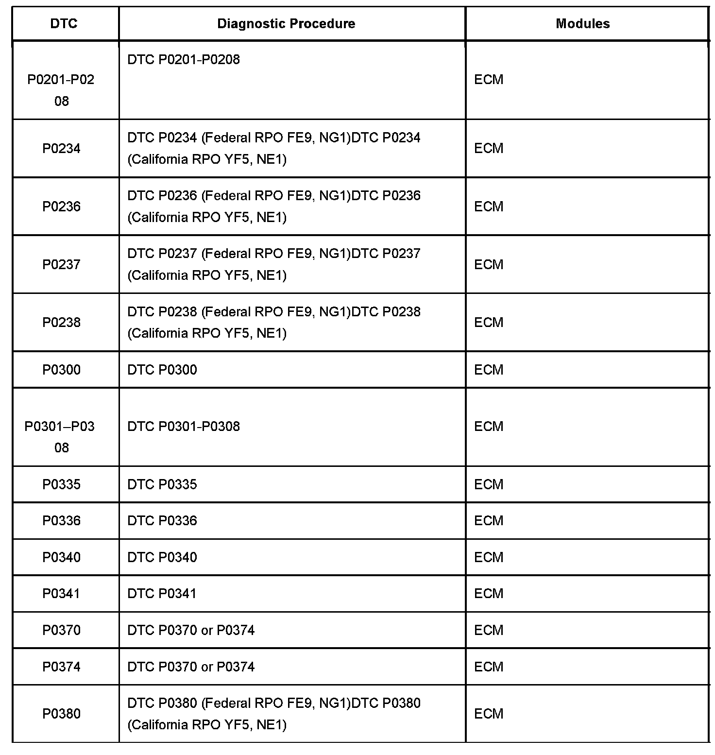 P0201 - P0380: