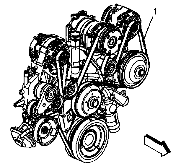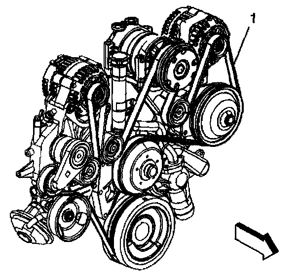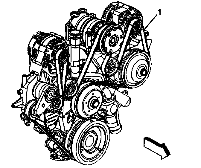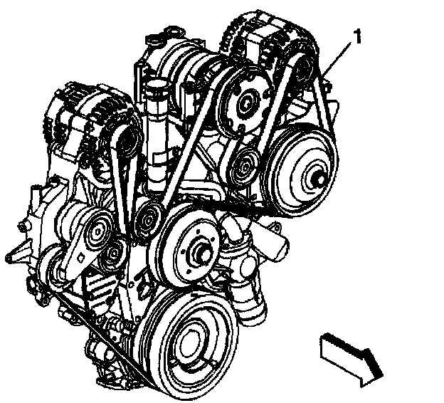 2. Install the drive belt (1) over all of the pulleys except the tensioner pulley, if equipped with a dual generators (Federal emissions).
