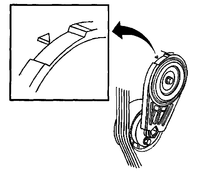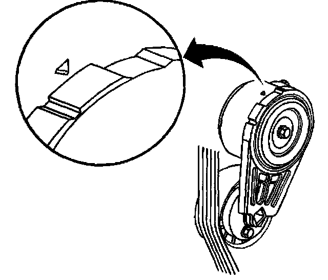 10. Confirm the proper drive belt size and the correct drive belt routing by observing the location of the pointer and index marks on the drive belt tensioner. With a new drive belt installed the pointer should align within the index marks on the drive belt tensioner.