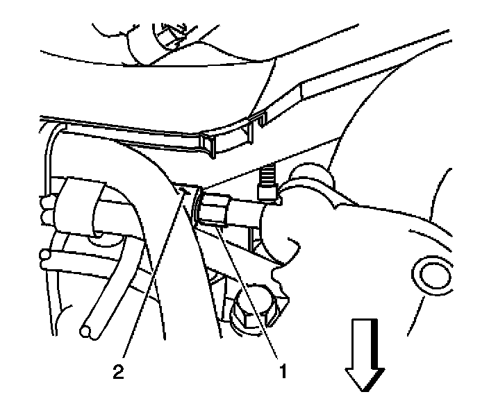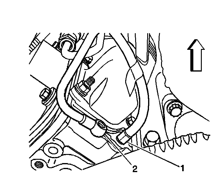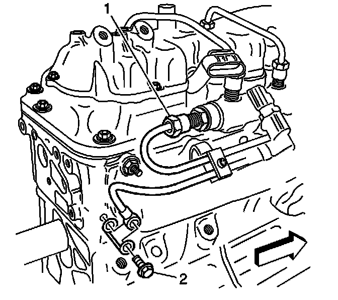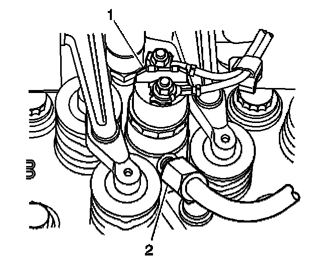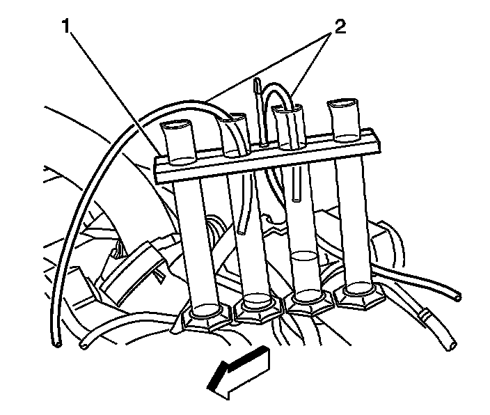 12. Install the other black hose (1) of the J 45873 to the leak-off block (2) and install the other end of the hose into another J 45873 graduated cylinders.