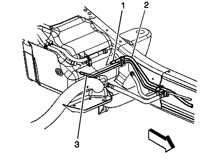 13. Disconnect the chassis fuel line from the short fuel line between the fuel sender and the chassis fuel line in front of the fuel tank (1).