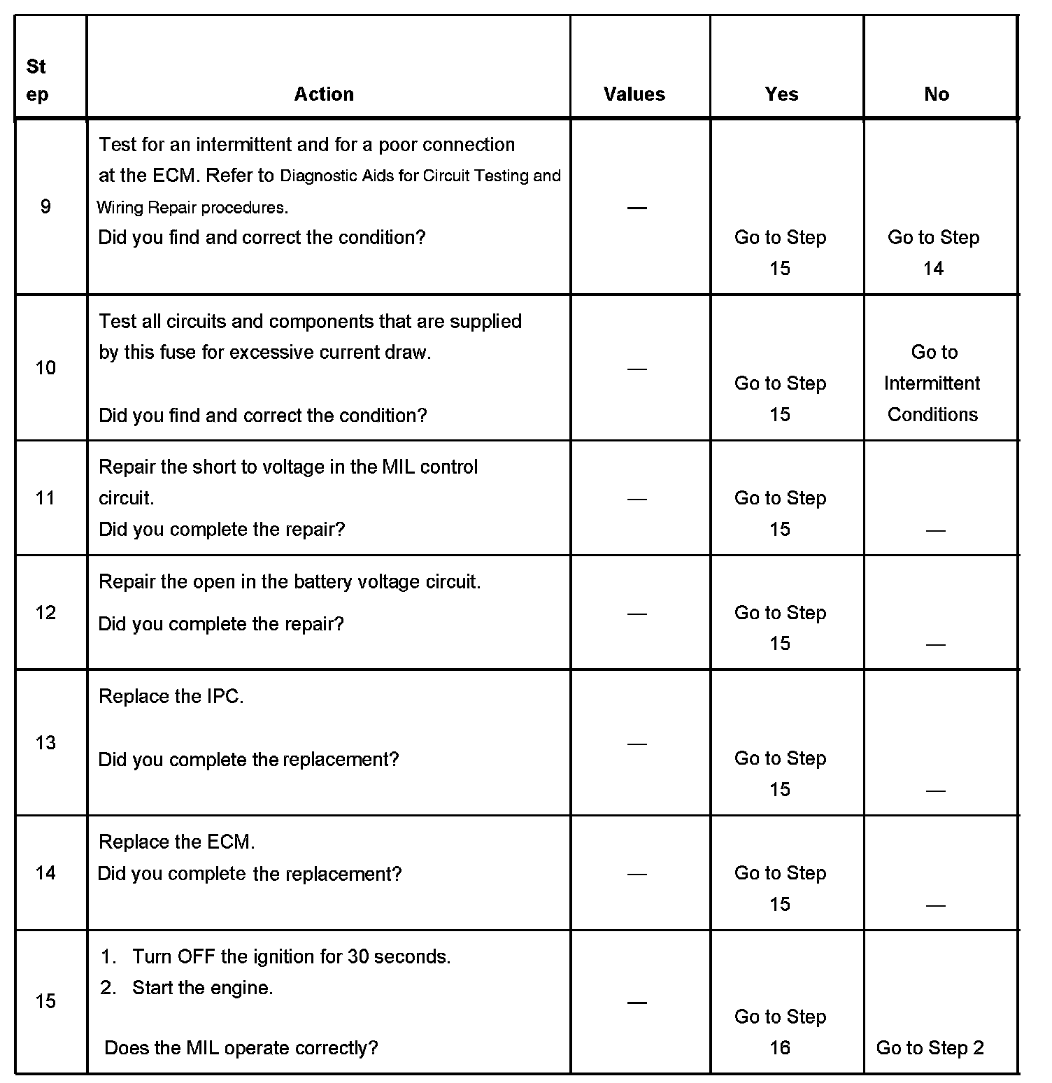 The number below refers to the step number on the diagnostic table.
