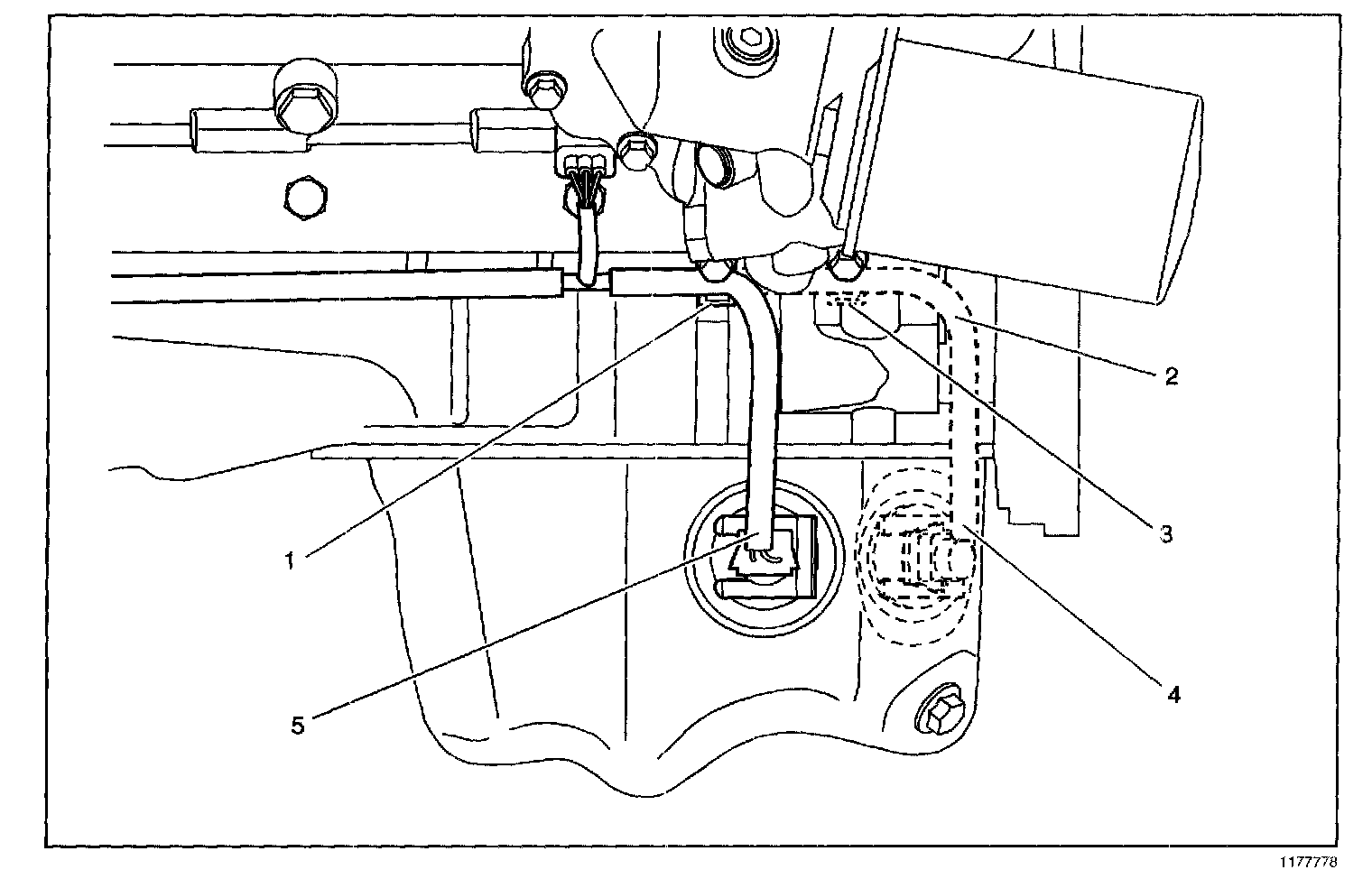 1. Unplug the oil level switch at the production location (5) and replace the lower oil pan using Service Manual procedures.