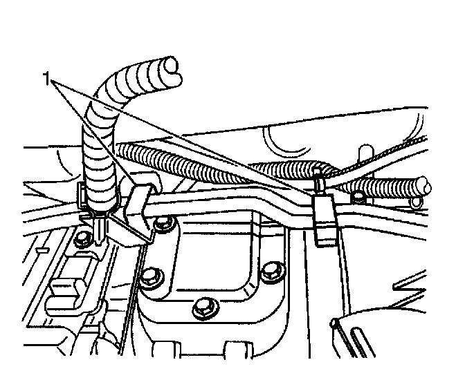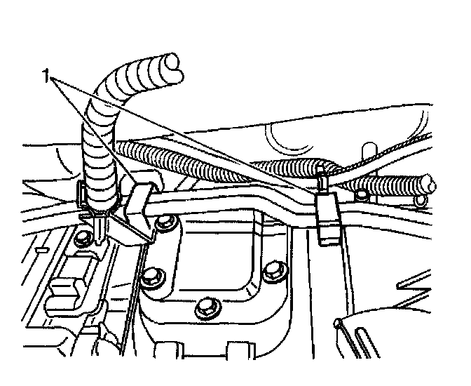 19. Install the fuel line retainers (1) and bolts to the left side of the transmission.