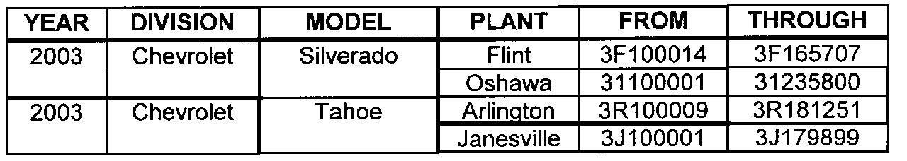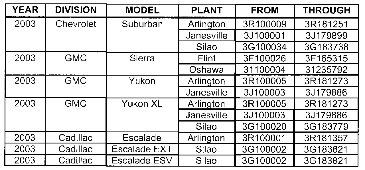 Involved are certain 2003 model year Chevrolet Silverado, Tahoe, and Suburban; 2003 model year GMC Sierra, Yukon, and Yukon XL; and 2003 model year Cadillac Escalade, Escalade EXT, and Escalade ESV vehicles equipped with Quadrasteer (NYS), Autoride (Z55), an (JL4) built within the VIN breakpoints shown.