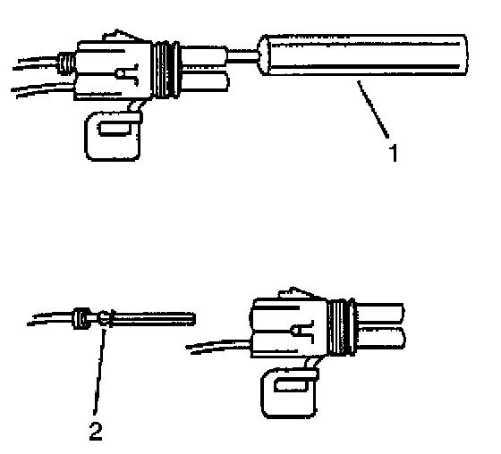 4. Insert the Weather Pack(r) terminal removal tool into the front (mating end) of the connector cavity until it rests on the cavity shoulder (1).