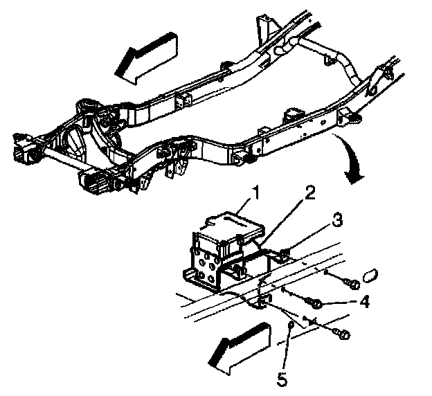 5. Loosen or remove 3 bolts (4) securing the EHCU mounting bracket (3) to the frame rail (5).