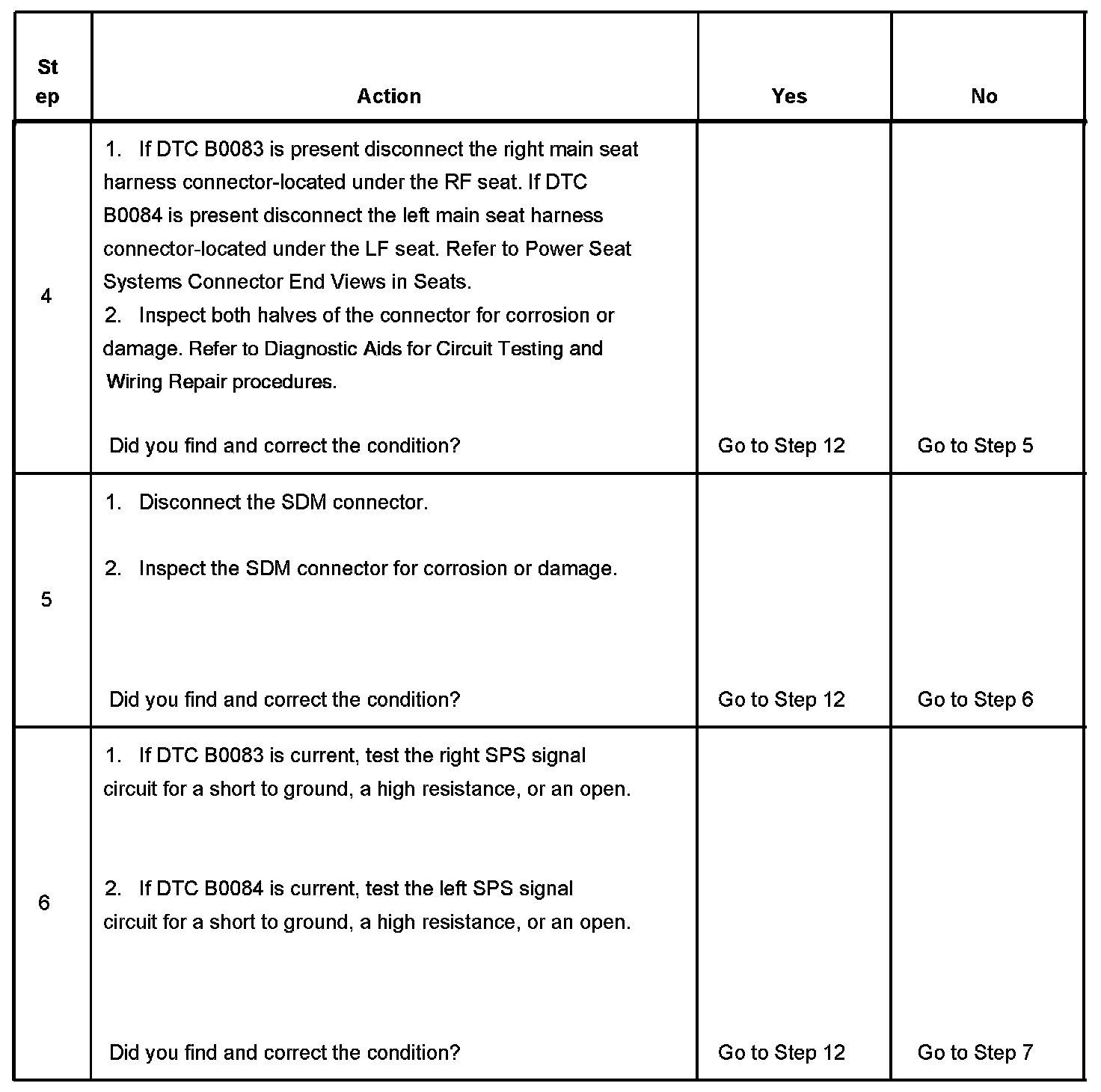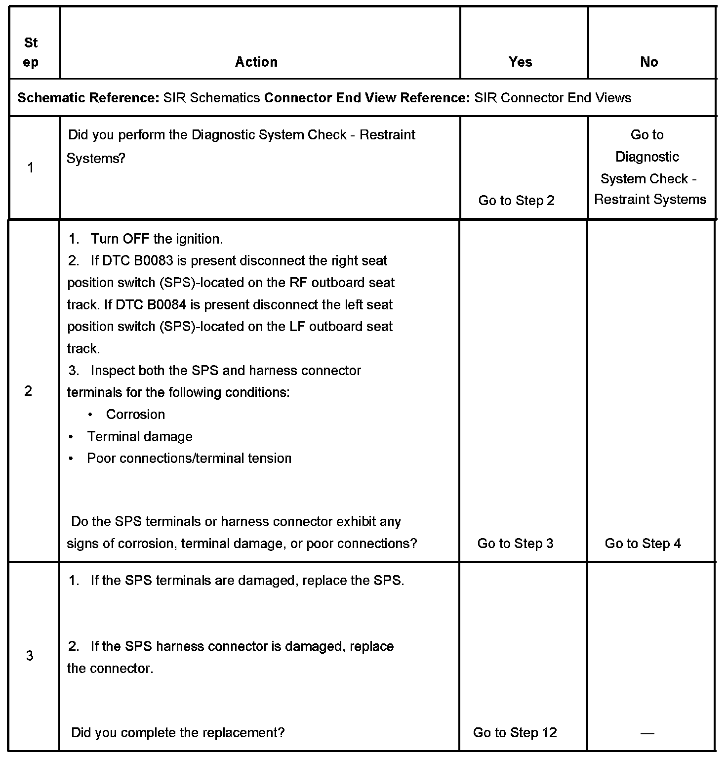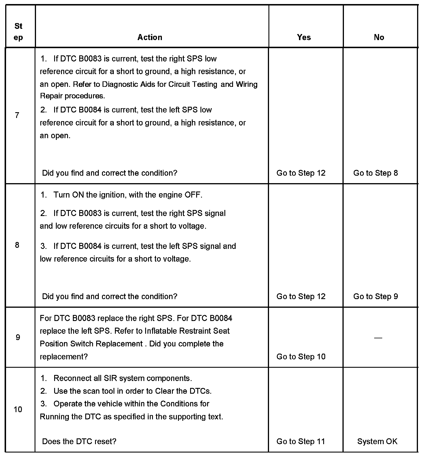 CIRCUIT DESCRIPTIONThe inflatable restraint seat position switch (SPS) is used to determine the proximity of a front driver or passenger seat position with respect to the frontal air bag. The SPS interfaces with the SDM. The state of the SPS allows the SDM to disable stage 2 of the frontal air bag for a front seat that is forward of a forward/rearward point in seat track travel. The SPS is a Hall effect sensor that is mounted on the outboard seat track of both the driver and passenger seats. The seat track includes a metal bracket that shunts the SPS magnetic circuit creating two states of seat position. The shunted state represents a rearward seat position. The non-shunted state represents a forward position. The SPS provides two current ranges, one range for the shunted state and a second range for a non-shunted state. These two states are inputs to the sensing and diagnostic module (SDM). State 1 (shunted) being the rearward threshold and state 2 (non-shunted) being the forward threshold. When the SDM receives input from a SPS that state 1 threshold is reached (seat is rearward) the SDM will not disable stage 2 deployment, if required by the deployment sensors. When state 2 threshold is reached (seat is forward) the SDM will disable stage 2 deployment on the side the seat is forward. The SDM monitors the SPS circuit and if a fault is detected the SDM will set codes B0083 or B0084 and defaults to disabling stage 2 frontal deployment. This will only default on the side of the vehicle the sensor has a fault. It's important to understand that the SPS is secondary to the passenger presence system (PPS) and the manual I/P module disable switch. If either one of these devices are in the disable mode the passenger air bag will not deploy regardless of the SPS status.