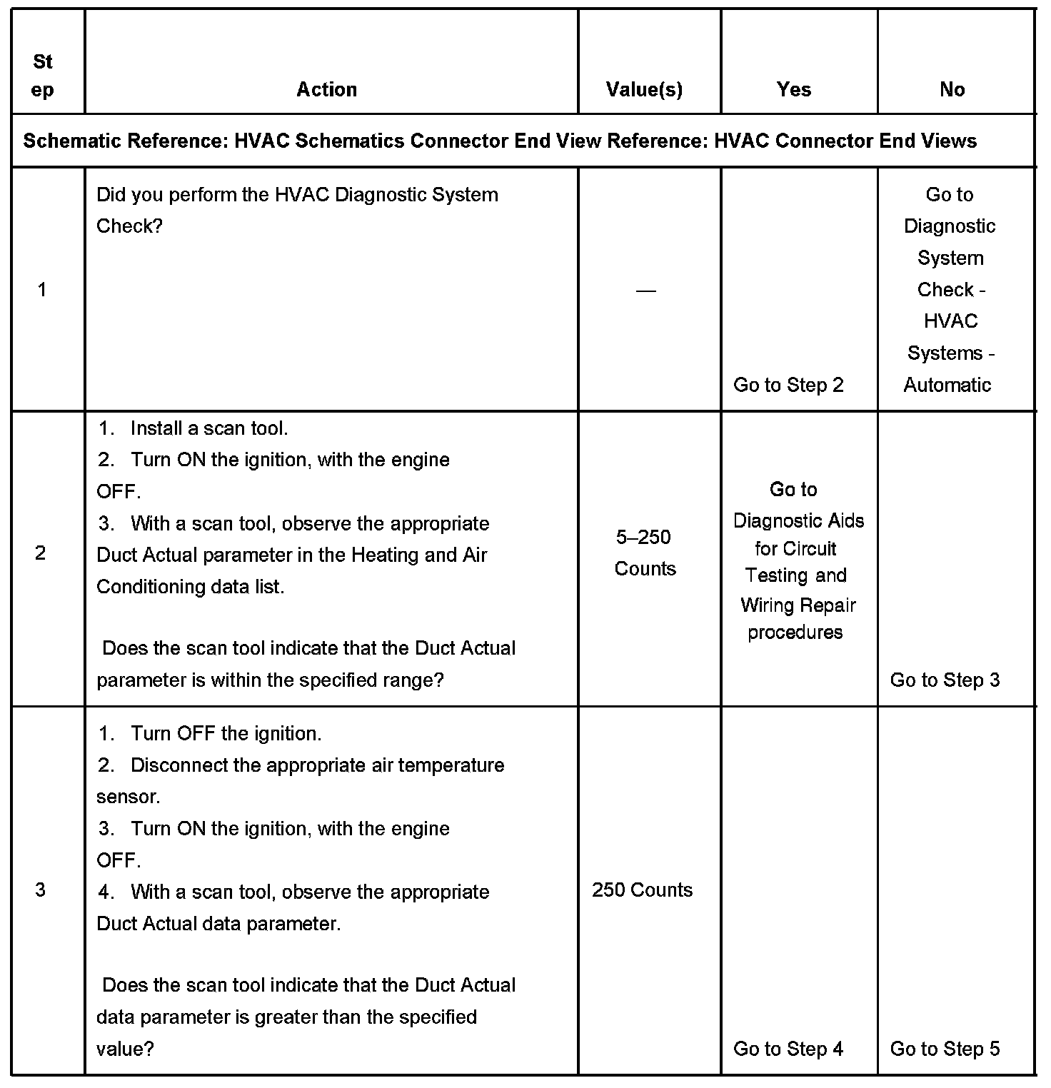Air temperature sensors allow the HVAC control module to monitor the temperature of the discharge air in the HVAC ducts. The module applies 5 volts to internal input resistors that are connected to the signal circuits of the air temperature sensors. The module provides ground to the air temperature sensors through the low reference circuit. The HVAC control module monitors the voltage drops across the air temperature sensors and uses the inputs for automatic control calculations. When the duct air temperatures are cold, the resistances of the sensors are high and the voltage signals are high. When the duct air temperatures are hot, the resistances of the sensors are low and the voltage signals are low. The HVAC control module converts the voltage values to count values where 1 V is approximately equal to 51 counts.