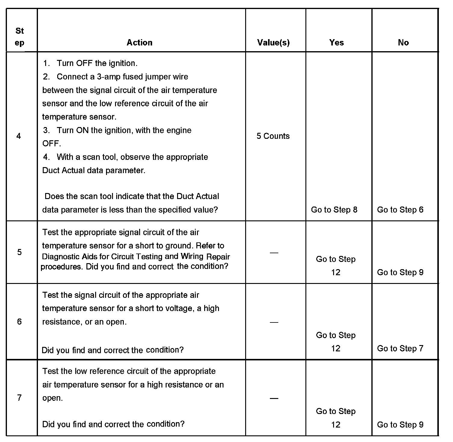 The numbers below refer to the step numbers on the diagnostic table.