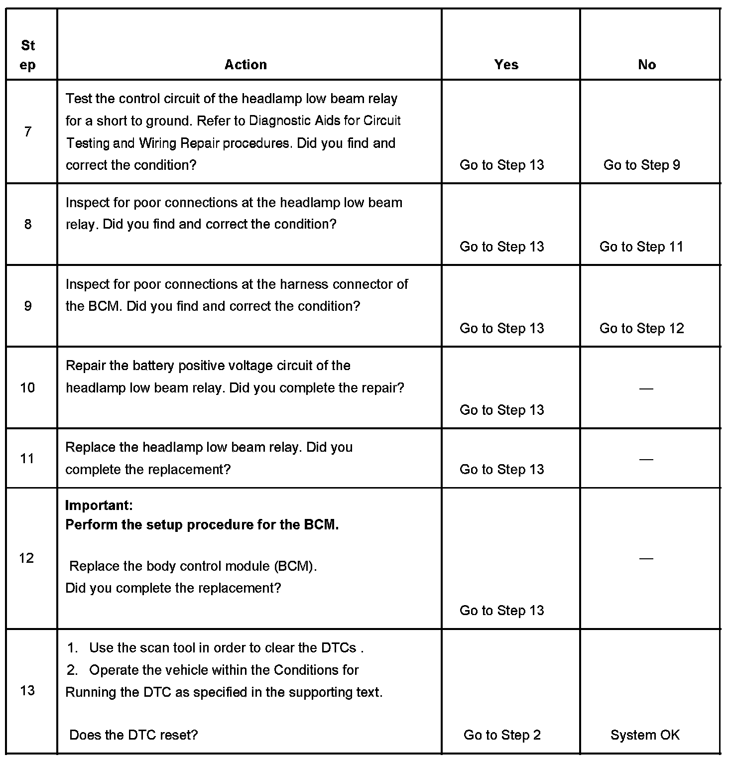 - When the BCM does not receive a command to illuminate the low beam headlamps and the headlamp low beam relay control circuit is shorted to ground.
