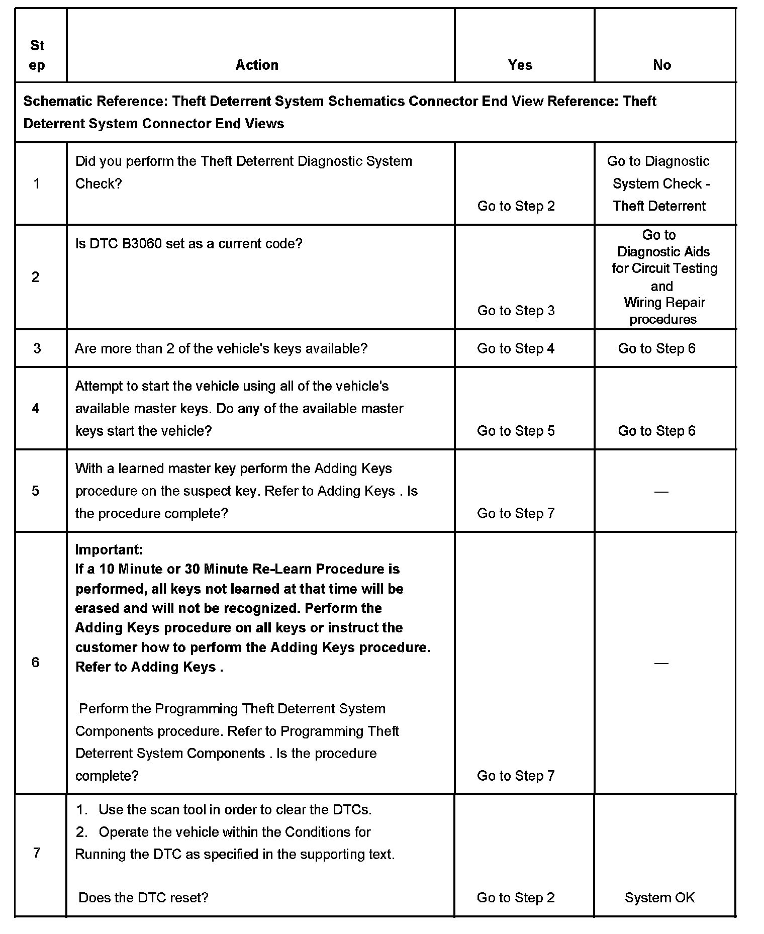 6. To set this DTC, a key with a working transponder that is not learned was read by the theft deterrent control module. For that key to operate the vehicle, a 10 Minute Re-Learn Procedure or 30 Minute Re-Learn Procedure must be performed.