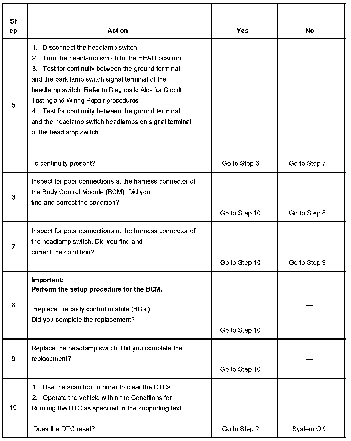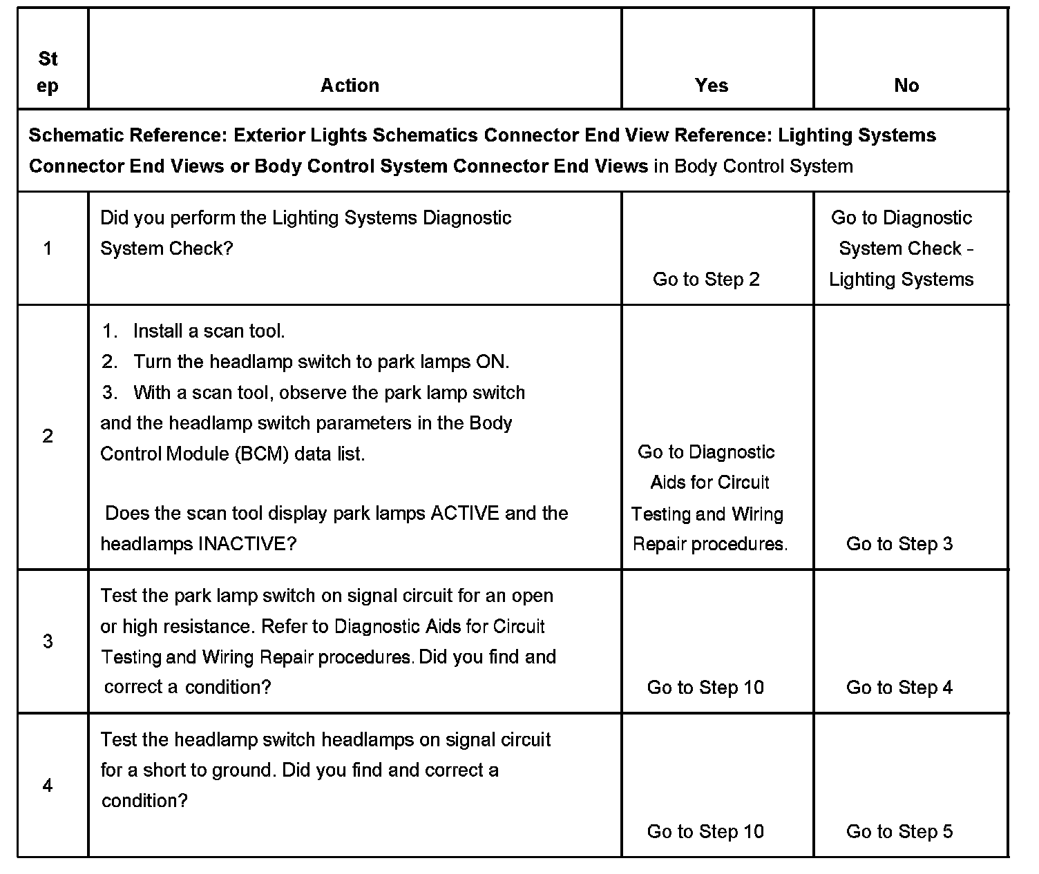 CIRCUIT DESCRIPTIONThe body control module (BCM) monitors the park lamp switch on signal circuit and the headlamp switch headlamps on signal circuit in order to determine when the park lamps and headlamps should be illuminated. When the headlamp switch is turned to PARK, the BCM senses that the park lamp switch signal on circuit is grounded and the headlamps switch headlamps ON signal circuit is open. The BCM will then energize the park lamp relay illuminating the park lamps. When the headlamp switch is turned to HEAD, the BCM senses that the park lamp switch on signal circuit and the headlamp switch headlamps ON signal circuit are grounded. The BCM will then energize the park lamp relay and headlamp low beam relay or high beam relay illuminating the park lamps and headlamps.
