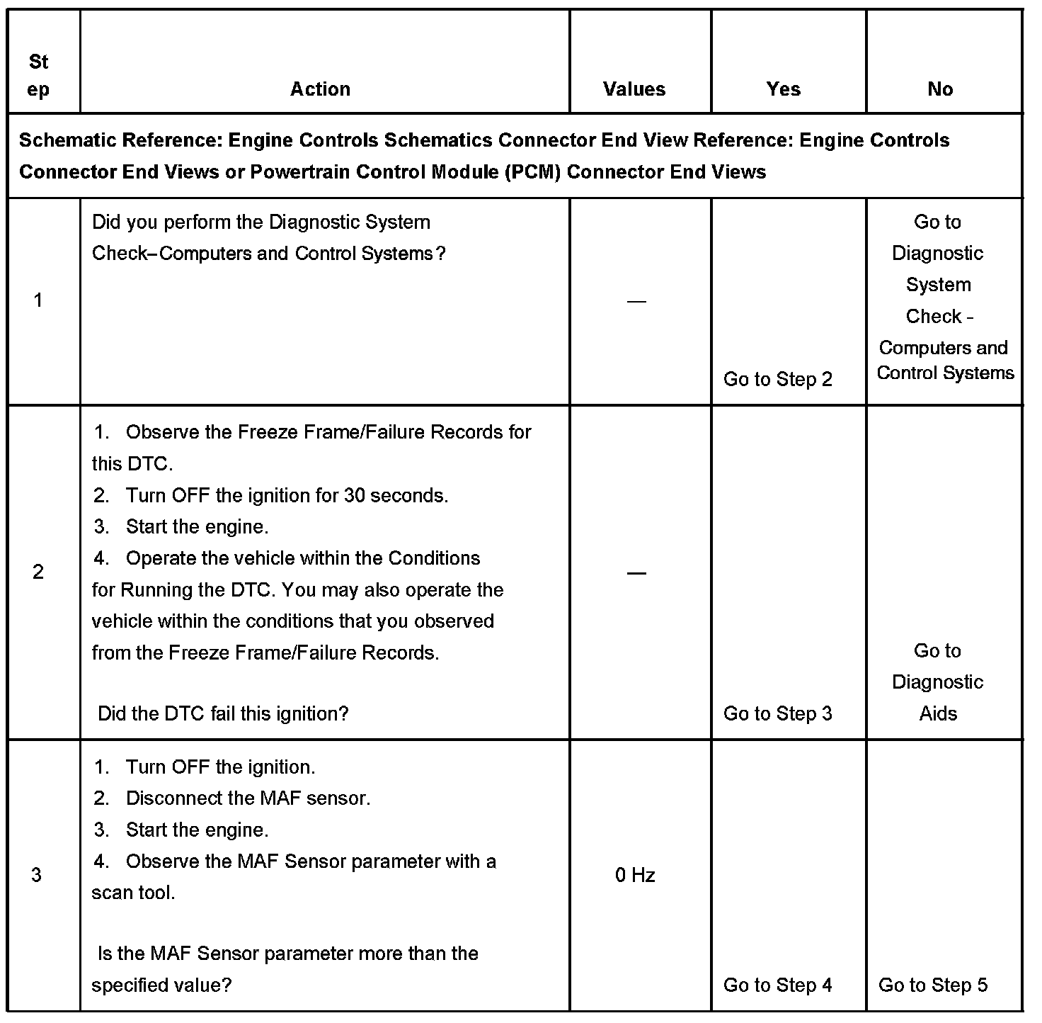 3. This step tests for Electromagnetic Interference (EMI) on the signal circuit of the MAF sensor. A frequency reading with the MAF sensor disconnected indicates an EMI related fault or a poor connection at the PCM. Disconnecting the MAF sensor may set additional related DTCs.