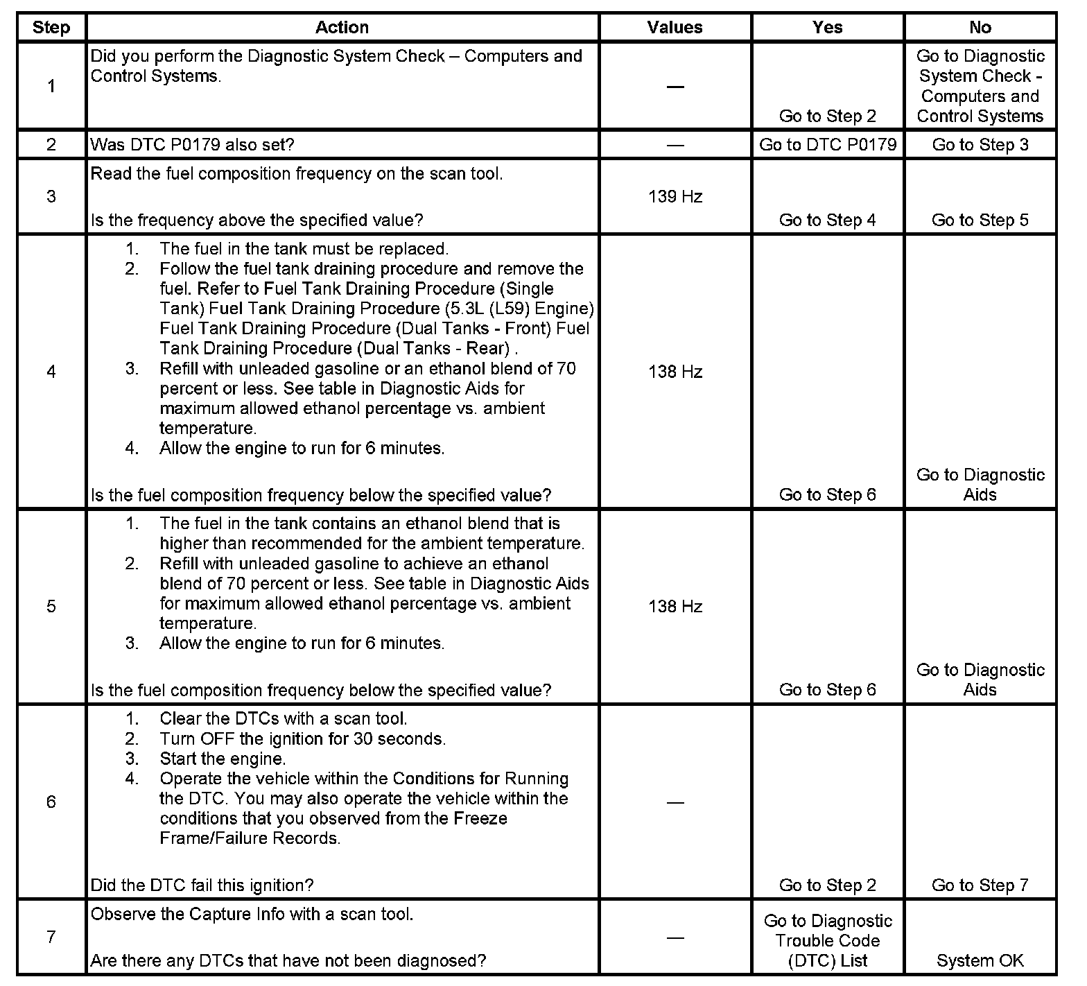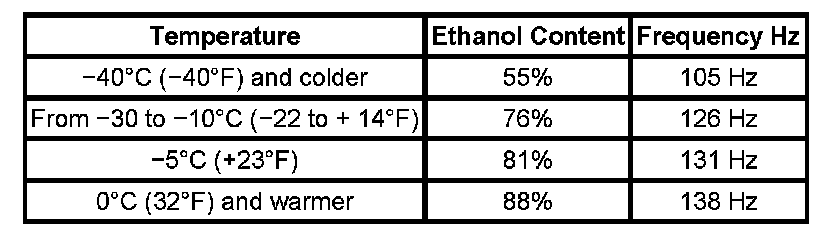 The powertrain control module (PCM) uses information from the intake air temperature (IAT) and the engine coolant temperature (ECT) sensors to determine ambient temperature at cold startup. Alcohol content (percentage) information is supplied to the PCM from the fuel composition sensor. This information is used by the technician in diagnosing symptom related complaints such as hard starting in cold ambient temperatures. The PCM monitors the fuel frequency during the first 30 seconds of run time. When the PCM detects alcohol content that is too high for a given ambient temperature, this DTC sets.