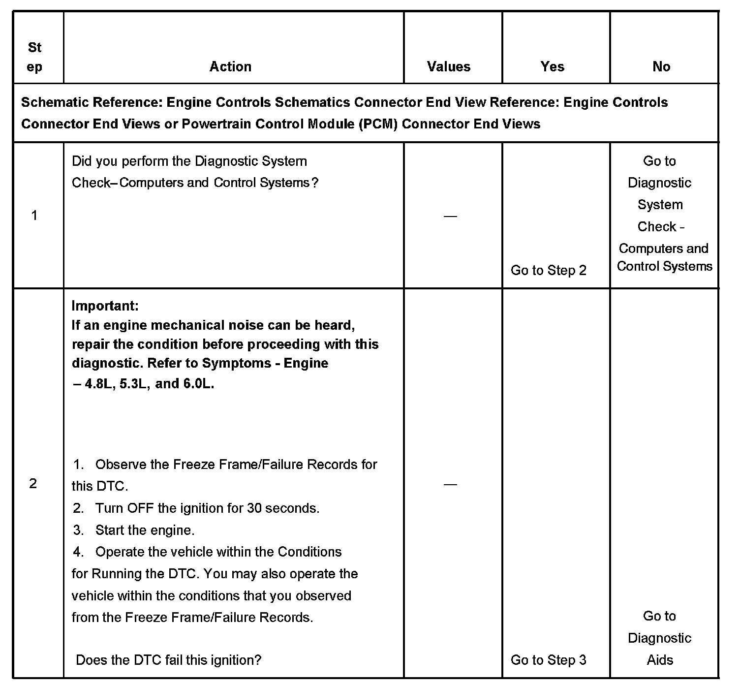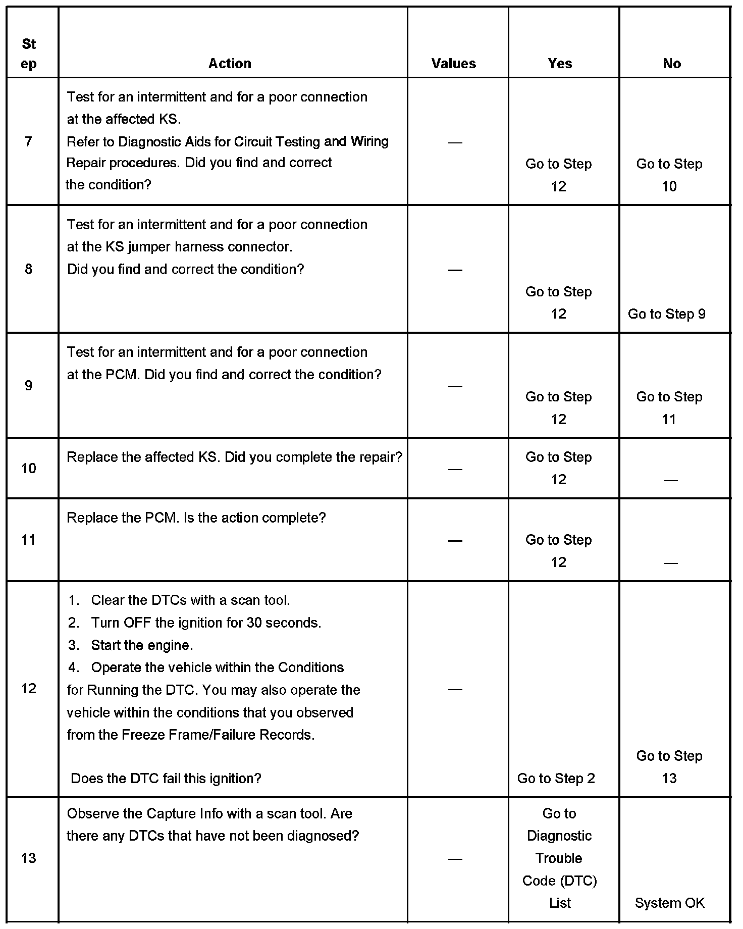 The numbers below refer to the step numbers on the diagnostic table.