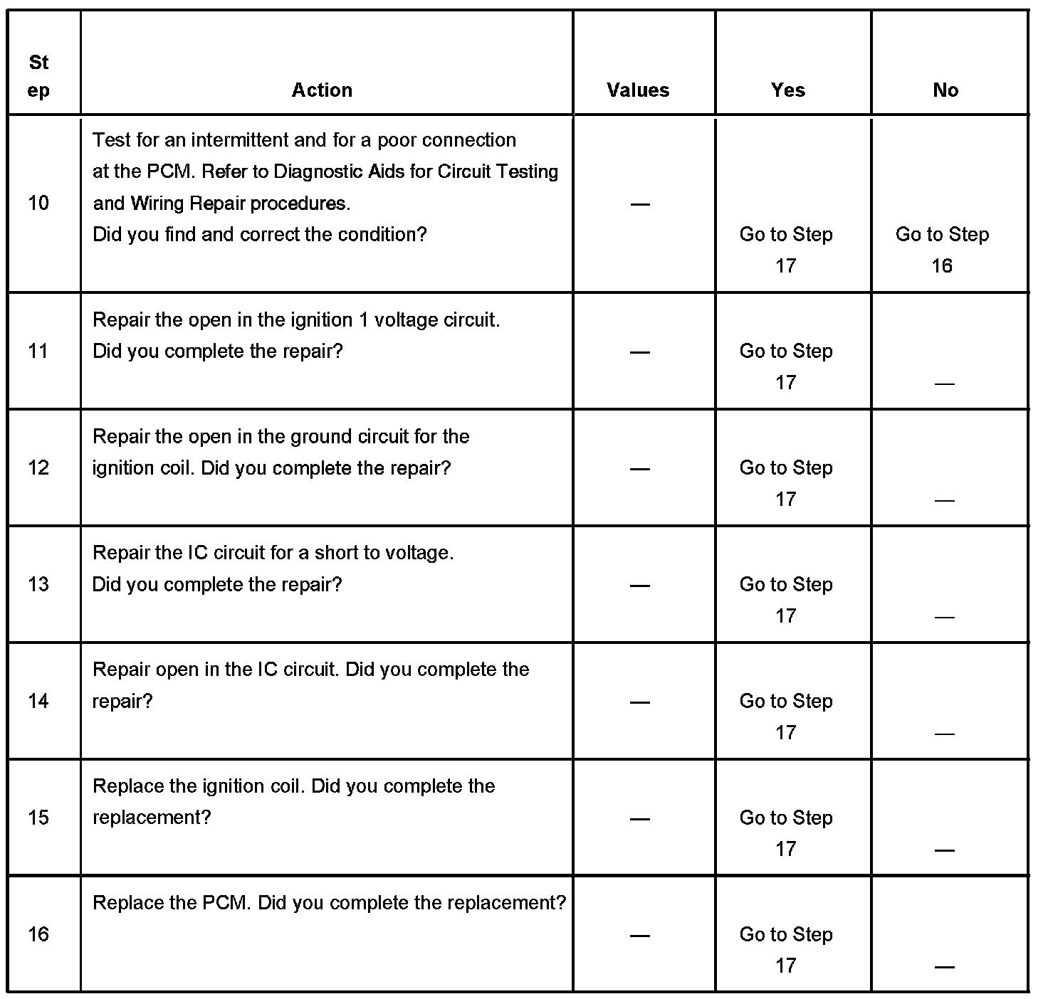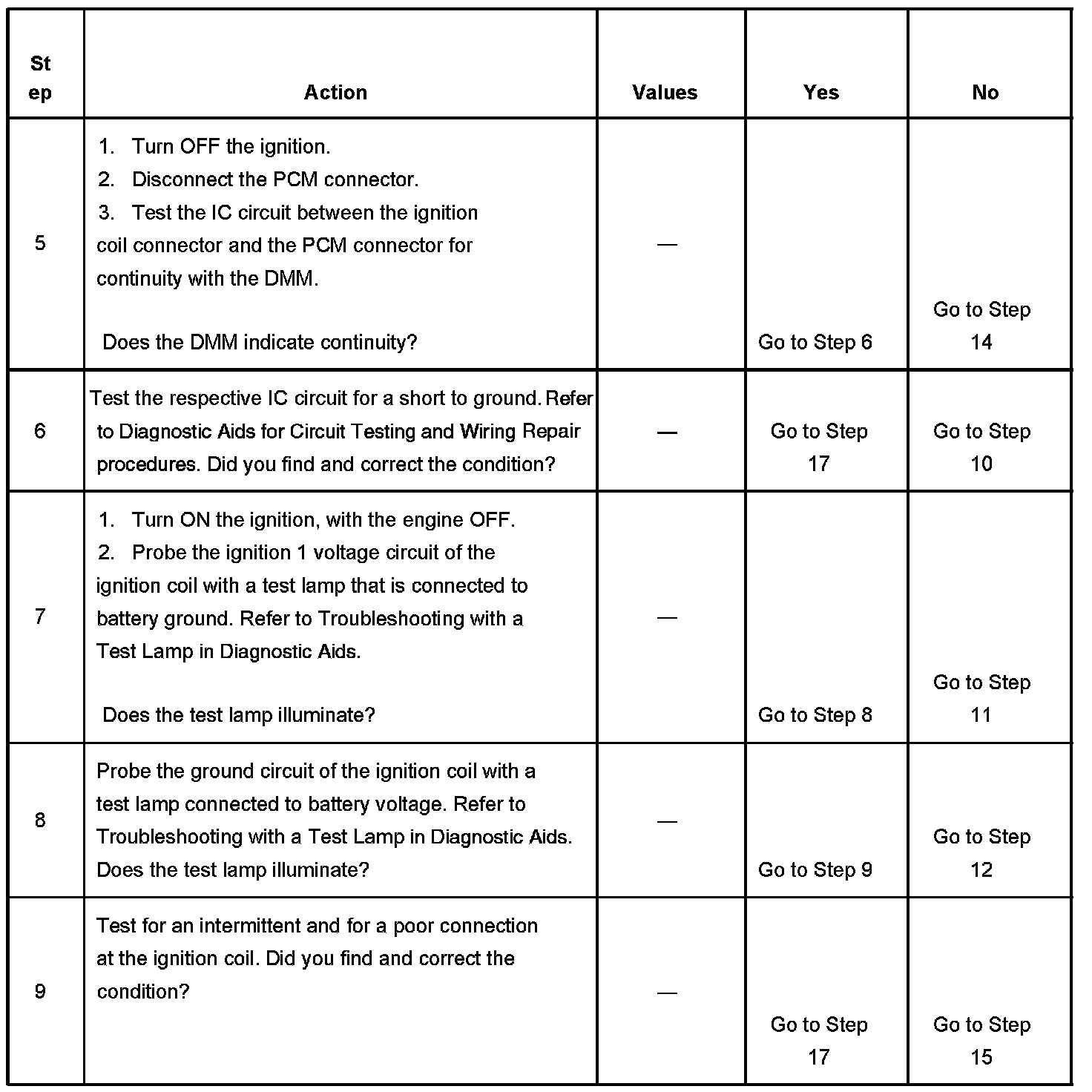 The numbers below refer to the step numbers on the diagnostic table.