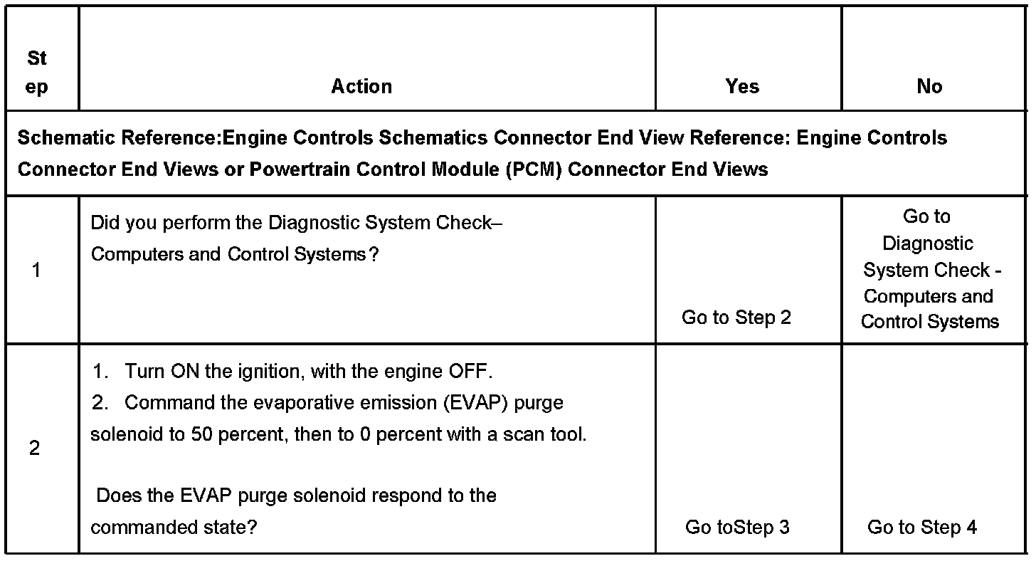 2. This step tests if the concern is active. The evaporative emission (EVAP) purge solenoid is pulse width module (PWM). You should hear a clicking sound when the purge solenoid is commanded to 50 percent. The clicking sound should stop when the EVAP purge solenoid is commanded to 0 percent. The rate at which the valve cycles should increase when the commanded state is increased, and decrease when the commanded state is decreased. Repeat the commands as necessary.